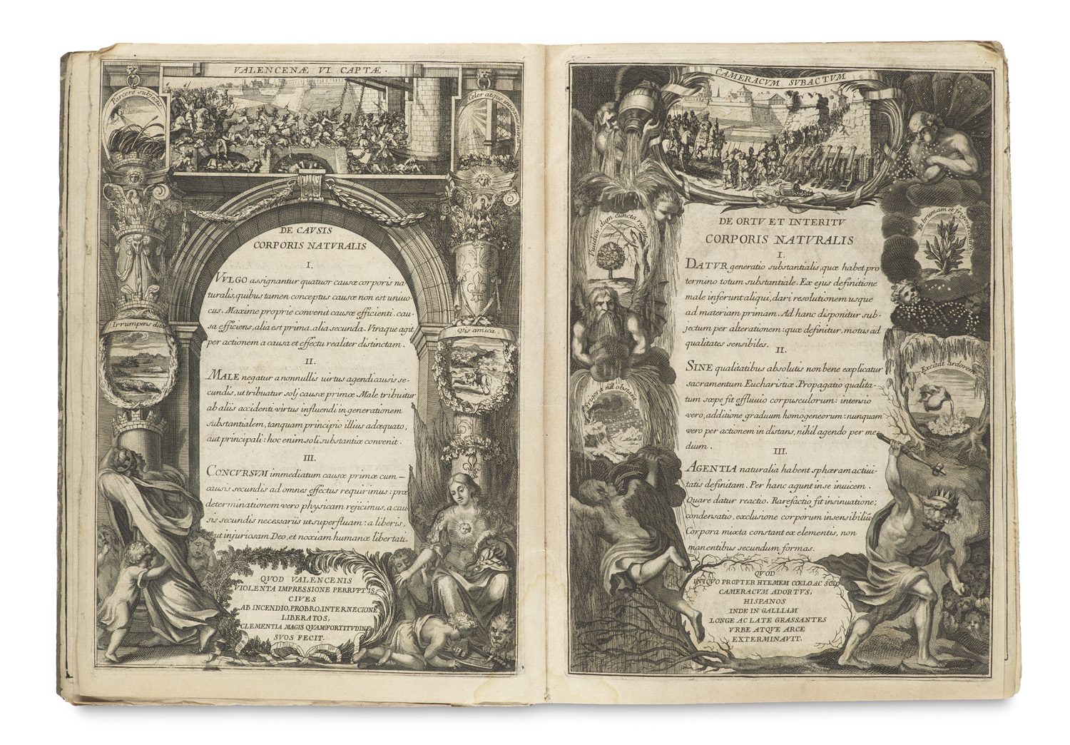 Ludovico Magno theses ex universa philosophia dicat et consecrat Ludovicus a Turre-Arverniæ princeps Turennius. 15 ganzseitige Kupferstiche. Bis zum Plattenrand beschnitten. Paris, Propugnabit in avla Colleg. Claromontani Societ. Jesu., 1679. Erstausgabe. 8 Bll. Folio. Spätere Broschur mit handschriftlichem Titel. (Rücken gerissen, Ränder stark bestoßen.)