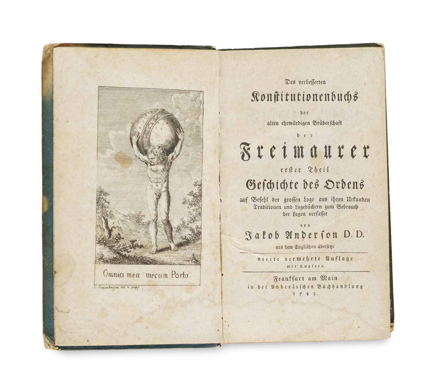 Des verbesserten Konstituitonenbuchs der alten ehrwürdigen Brüderschaft der Freimaurer. Aus dem Englischen übersetzt. Vierte vermehrte Auflage. 2 Tle in 1 Band. Mit 2 gestochenen Frontispizen, davon 1 von E. Riepsenhausen und 1 alt koloriert und 1 mehrfach gefalteten Kupferstichtafel sowie 5 (statt 6) gefalteten Tabellen. Frankfurt am Main, Andreäsische Buchhandlung, 1783-1784.(13) Bll., 626 S., (5) Bll., 410 S. Pbd. d. Zt mit hs. RSchild.