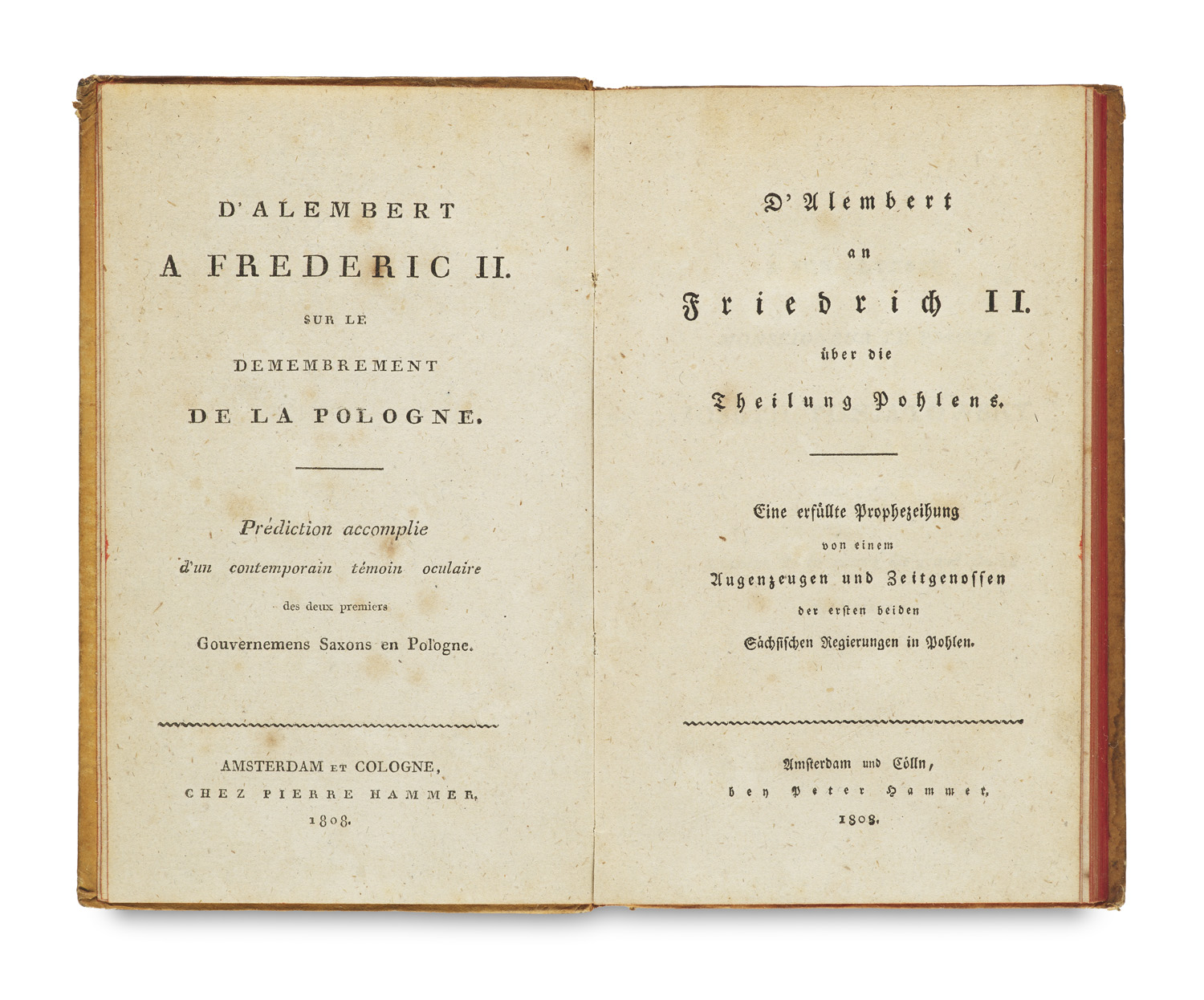 D'Alembert an Friedrich II. über die Theilung Pohlens. Eine erfüllte Prophezeiung von einem Augenzeugen und Zeitgenossen der ersten beiden sächsischen Regierungen in Pohlen. (Übers. von Karl Fischer). / D´Alembert Frédéric II. sur le Démembrement de la Pologne Prédiction accomplie d' un contemporain témoin oculaire des deux premiers gouvernemens saxons en Pologne. (Franz.-dt.). Amsterdam u. Köln (d.i. Leipzig), Hammer, 1808. XCV, 184 S. Pp. d. Zt. mit RVerg. u. RSchild (etw. berieben u. leicht fleckig).