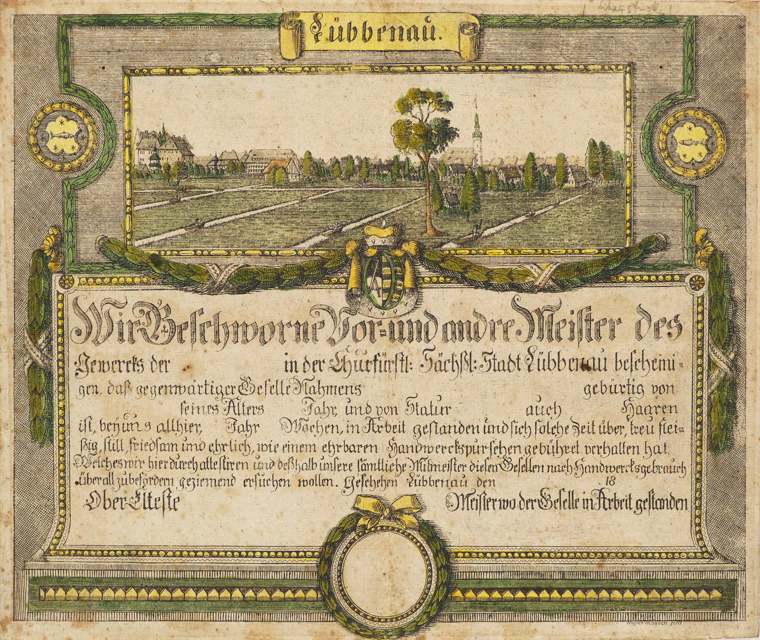 History – Journeyman's certificate. Lübbenau, 19th century. Colored engraving on handmade paper. - Sample certificate confirming the employment of a journeyman craftsman with a master craftsman. With spaces to fill in. - With a view of Lübbenau on the upper half of the certificate. - Minimal wormholes, foxing, slight edge wear. Overall in good condition with green and yellow coloring.