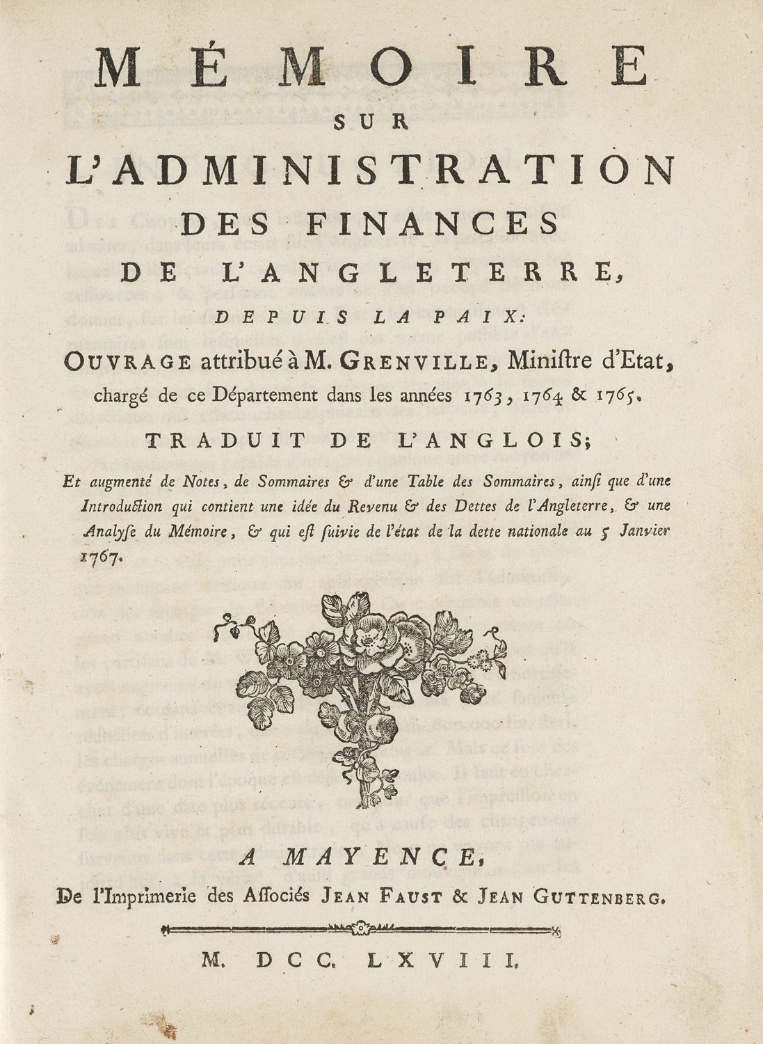 Mémoire sur l'administration des finances de l'Angleterre depuis la paix. Ouvrage attribué à M. Grenville, Ministre d'état, chargé de ce département dans les années 1763, 1764 et 1765. Traduit de l'anglois (...). Mit 1 mehrfach gefalt. Tabelle. Mayence, Faust & Guttenberg, 1768. 1 Bl., XLVIII., 210 S., 1 Bl. 4°. Ldr. d. Zt. mit RVergoldung, dreiseitigem Rotschnitt u. Marmorpapier Vorsätzen (etw. beschabt, berieben u. bestoßen).