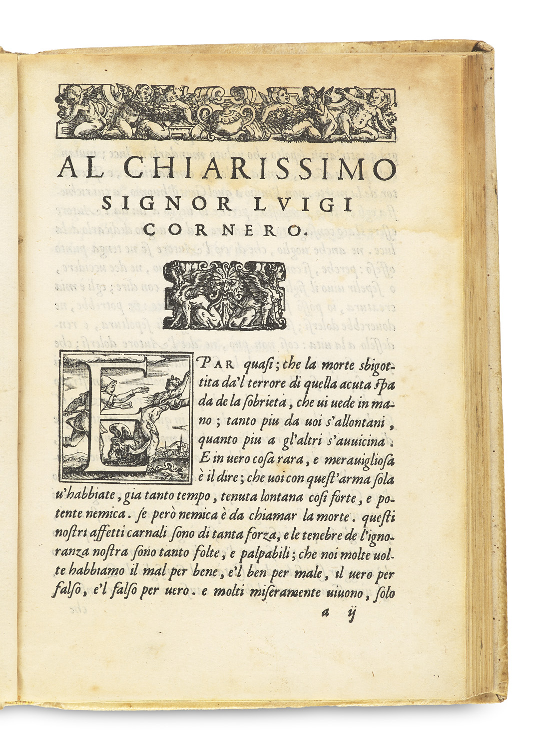 Prints before 1600, Bibles, Classics in Original Languages – First edition, first printing of this classic of late Renaissance Italian literature. - With 2 woodcut emblems of printer Giolitano, one on title page and another in varied form on last page verso, furthermore 5 pictorial woodcut initials as well as 16 mainly pictorial head-pieces and vignettes. - A collection of fictional dialogues among Venetian writers on death and other topics, preceded by a text of linguistic significance in the form of a letter, discussing the Italian literary language ('lingua volgare'). - Giolitos richly illustrated and large-format printer's mark is repeated on the verso of the last page. The initials and decorative head-pieces are richly and variedly enlivened throughout. - Leaves a-c8 waterstained, soiled and browned in places, rear fly-leaf with small tears along the outer edge. Overall, a well-preserved copy of this elegantly typeset and decoratively printed book.