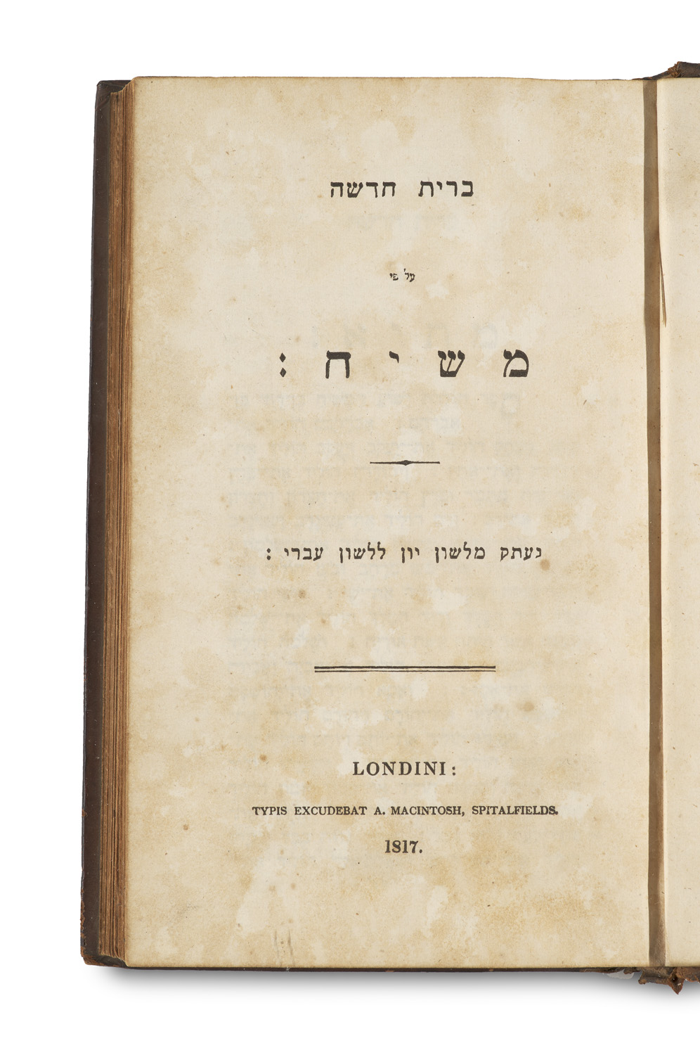 Berit hadasha 'al pi Mashiah: ne'etak mi-leshon Yavan lileshon 'Ivri (= das Neue Testament auf Hebräisch). London, Typis excudebat A. MacIntosh, Spitalfields, 1817. 246 Bll. 8°. Ldr. d. Zt. (beschabt, berieben u. bestoßen, VGelenk angebrochen).
