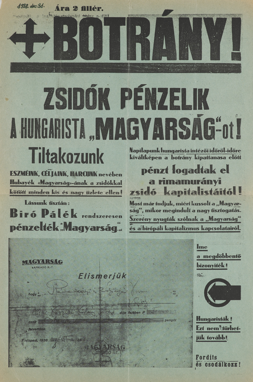 Botrány! Zsidok pénzelik a Hungarista "Magyarság"-ot! (dt. Skandal! Juden finanzieren die ungarische "Magyarság"!) I. Tarr, 1. Dezember 1938. 47 x 31,5 cm. Zweiseitiges Plakat auf grünem Papier.