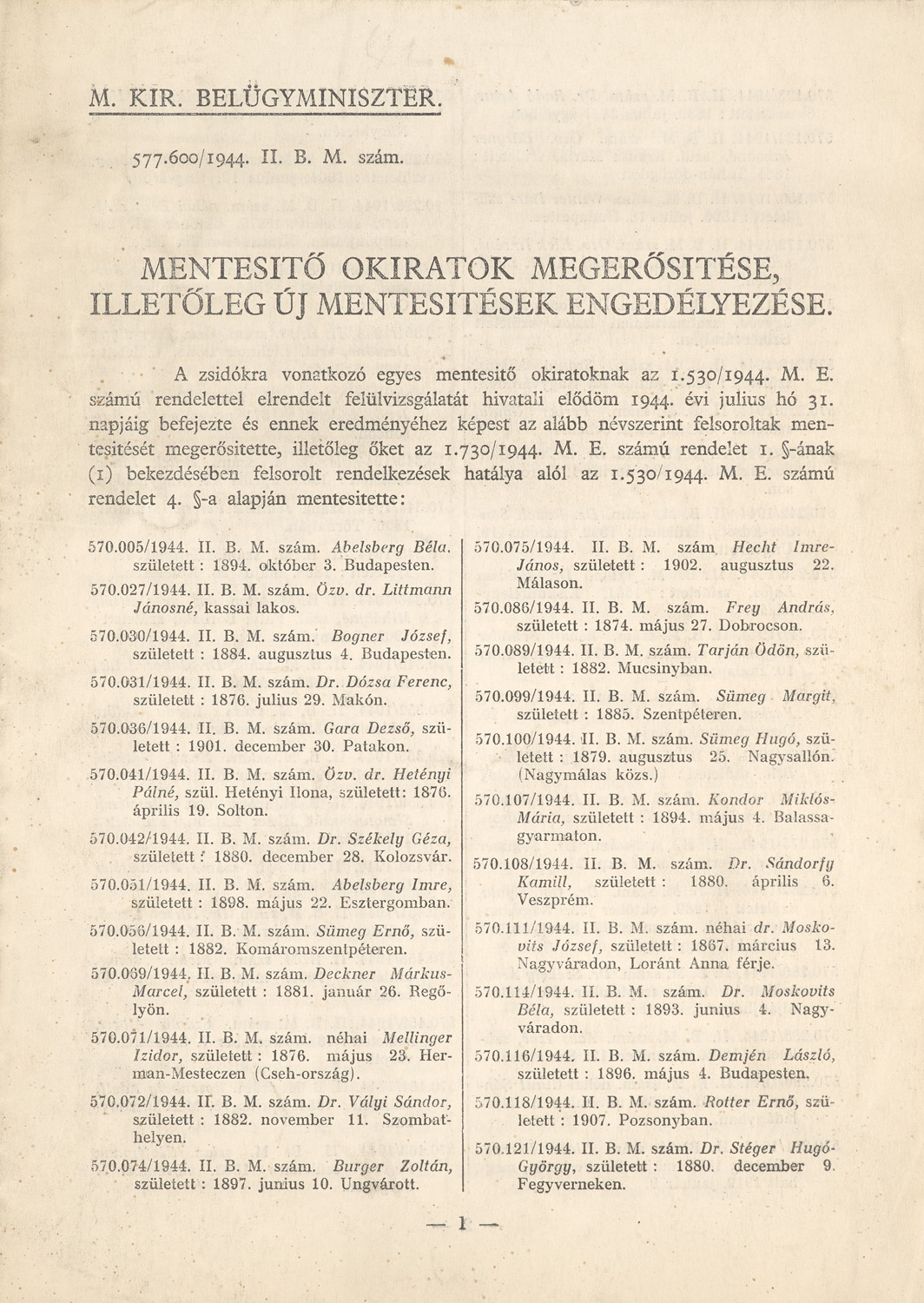 M. Kir. Belügyminiszter. 577.600/1944. II. B. M. szám. Mentesíto okiratok megerosítése, illetoleg új mentesítések engedélyezése. Budapest, 29. November 1944. 15 S. 4 °. OBroschur.