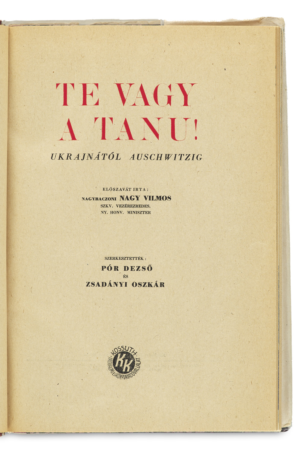 Te vagy a tanu! Ukrajnától Auschwitzig. Elöszavát irta Nagybaczoni Nagy Vilmos szkv. vezérezredes, ny. hon. miniszter. Mit 44 Abbildungen. Budapest, Kossuth Irodalmi és Konyvkiadóvállalat, 1947. Erste Auflage. 424 S. OHLwd. mit OBuchumschlag. (Rücken leicht bestoßen, Umschlag teils abgebrochen.)