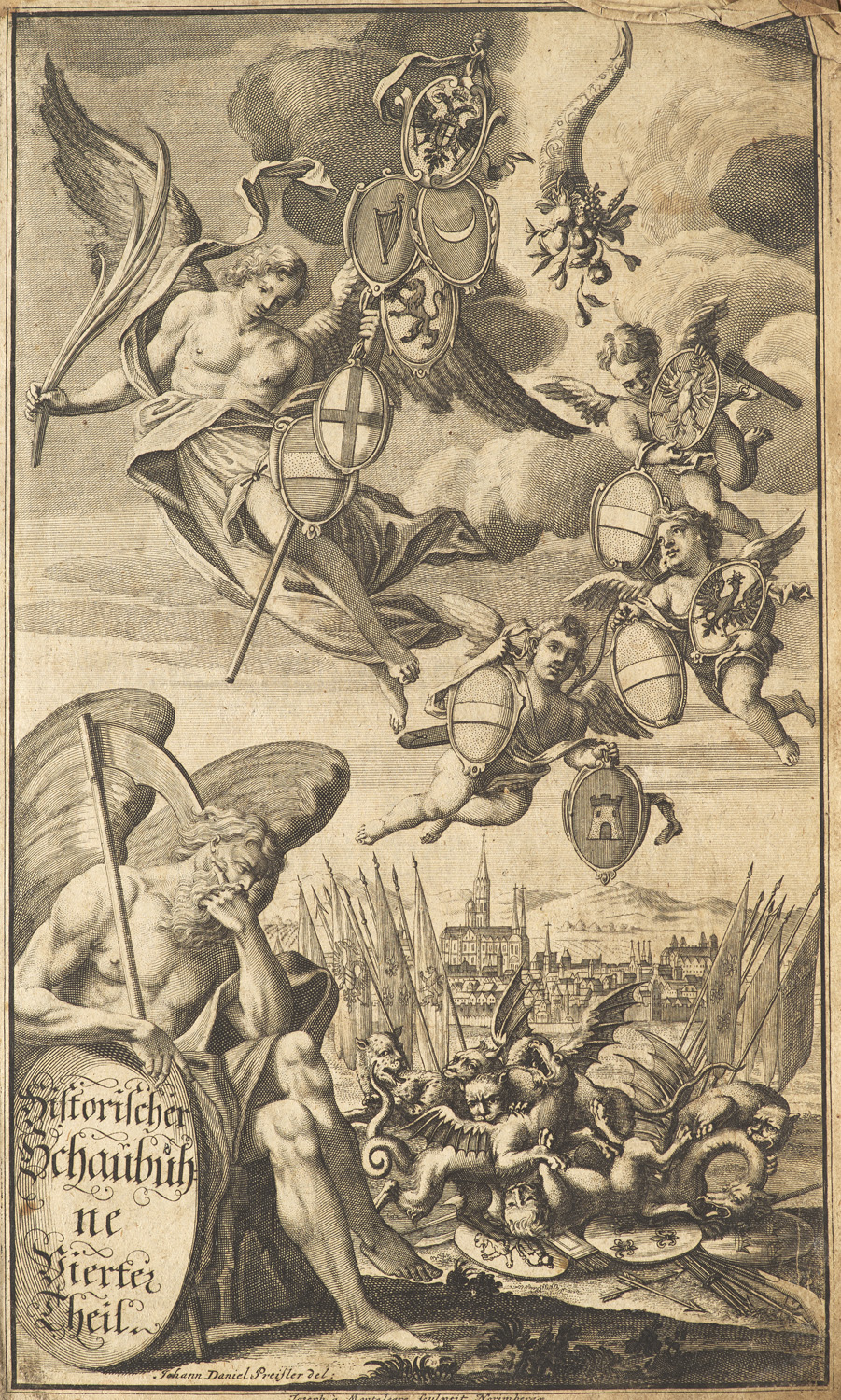 Allgemeine Schau-Bühne der Welt, oder: Beschreibung der vornehmsten Welt-Geschichte ... des siebzehenden Jahr-Hunderts. Teil 2-5 (von 5) in 4 Bden. Mit 3 gestoch. Titeln, Kupfertafeln u. zahlr. Textkupfern. Frankfurt, Zunner / Jung, 1701-1731. Fol. Pgt. d. Zt. (berieben, beschabt, bestoßen, fleckig, tls. Gelenke eingerissen u. geplatzt u. Deckel gelockert, VDeckel von Bd. 5 vom Block gelöst, Bezug tls. mit Fehlstellen u. stellenw. von den Deckeln gelöst).