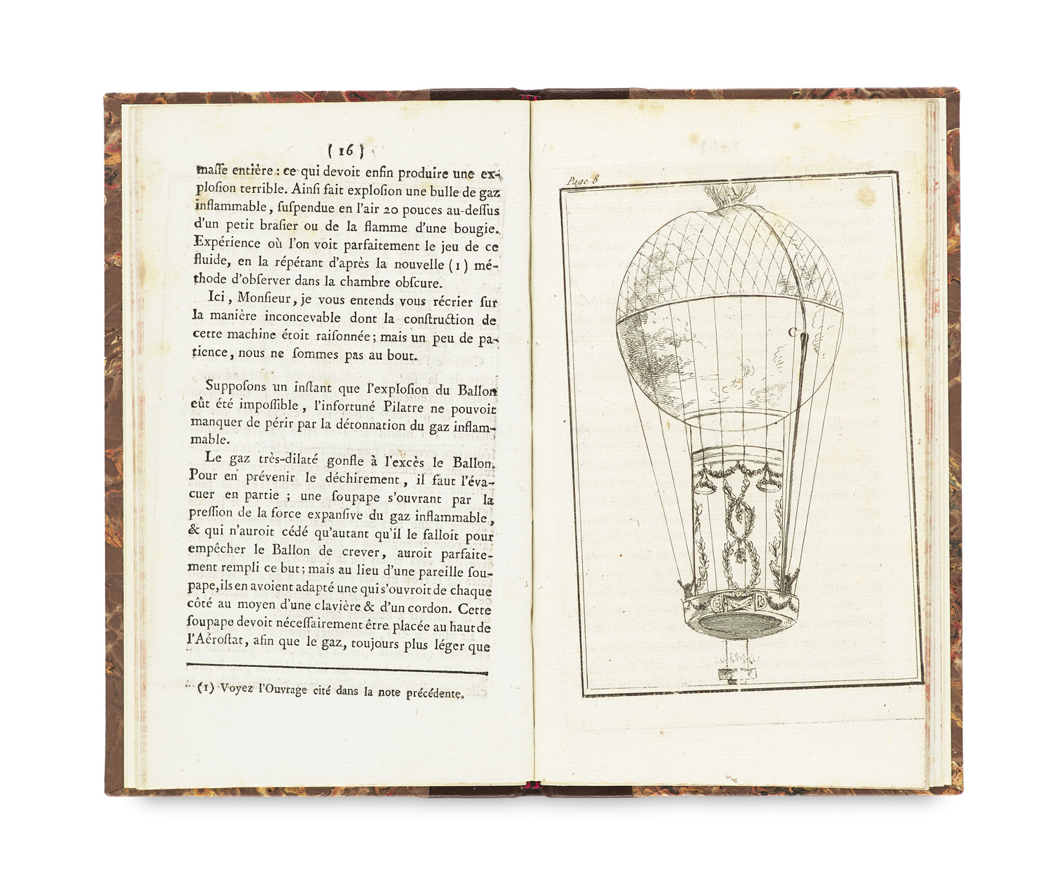 History – With an engraved frontispiece and a copperplate. Modern half leather with mounted, gold-stamped backplate and speckled edges. - Extremely rare. - With handwritten ownership note on the verso of the frontispiece. - A work about the first comprehensively documented accident in aviation history. During their attempt to cross the English Channel from France in a hot-air balloon, Jean-François Pilatre de Rosier and Pierre Romain crashed. The physician and later protagonist of the French Revolution, Jean Paul Marat, describes the fatal crash in this volume and names possible causes for the accident. - Handwritten ownership note on the frontispiece is visible. Slightly foxed. Overall, very well preserved.