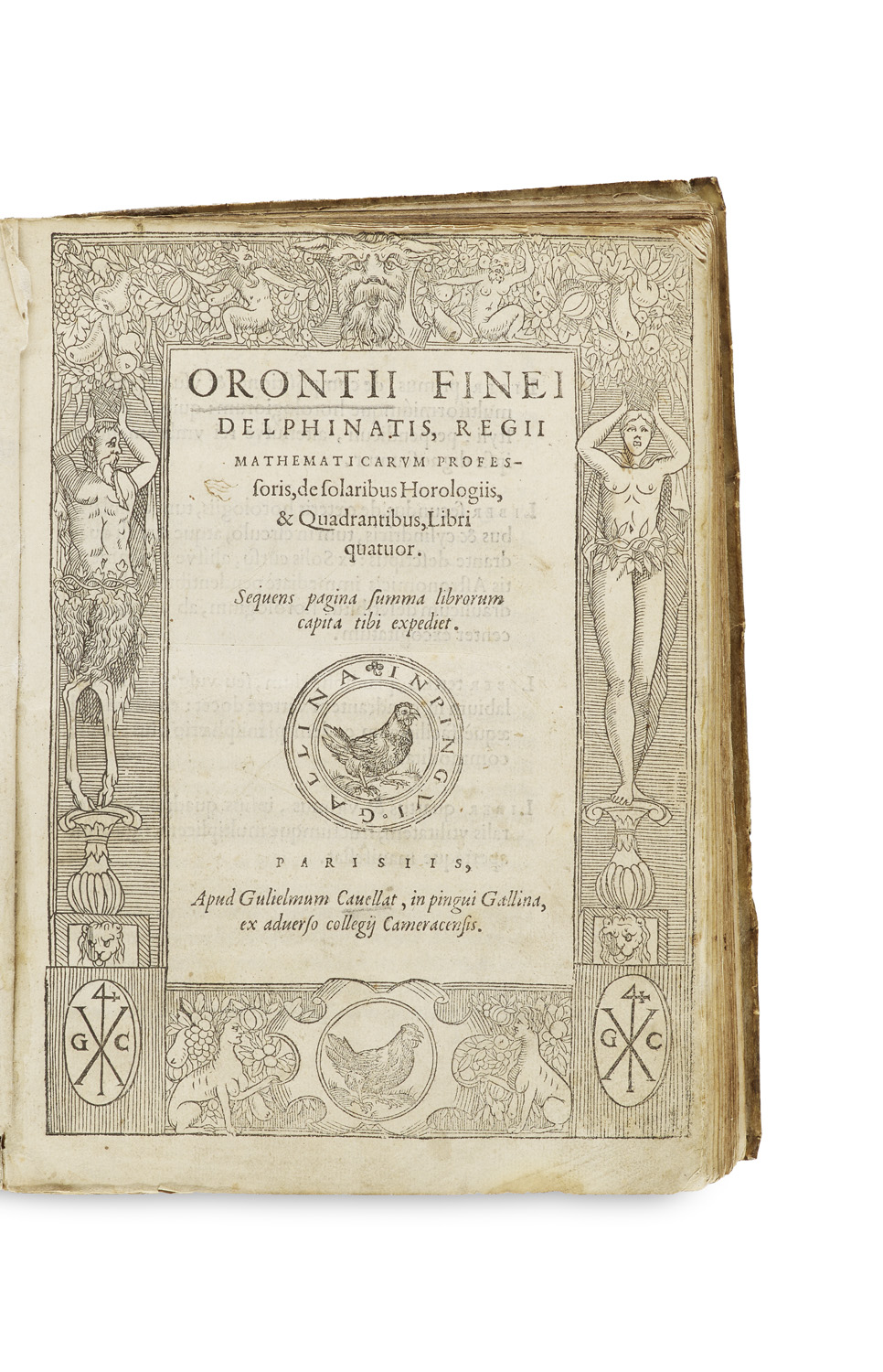 Prints before 1600, Bibles, Classics in Original Languages – First impression of the first independent edition of Finés most important horological work. - For references see above. - Edition published posthumously by Oronce Finés (1494-1555), the renowned mathematician and professor at the Collège Royal, son Jean, here in the first edition without the year indicated on the title page. The first printing of Finé's horological magnum opus was published as part of his "Protomathesis" (1532). - The wood-cuts depict sundials, clepsydrae and other ancient time-keeping instrument including diptychs, rings, multi-faceted and pillar dials, quadarants, mariner's astrolobes, as well as the mathematical or astronomical principles governing their use and desig - The folding plate is missing. - Bound together with the fourth edition of Finé's Arithmetic, divided into four chapters on integrals, ordinary fractions, sexagesimal fractions, and proportions. - Missing the title page. - Slightly foxed and soiled in places, occasionally slightly waterstained, overall, a well-preserved copy of these two early and important works on applied mathematics.