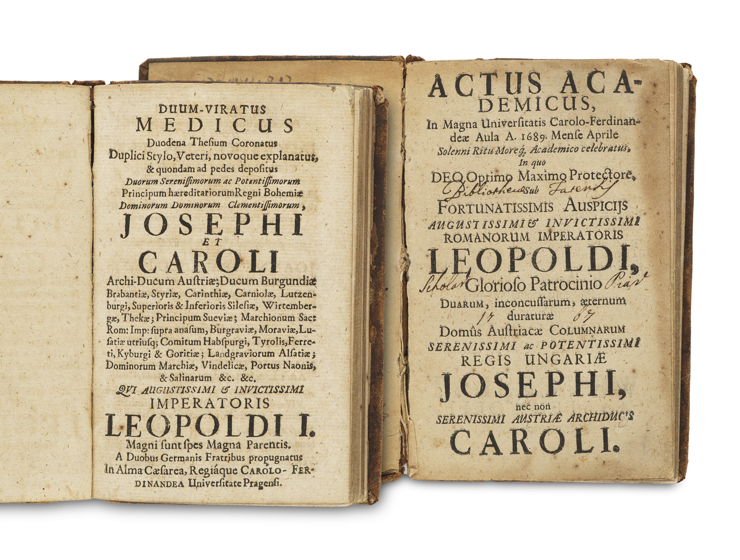 Actus academicus, in magna Universitatis Carolo-Ferdinandeae aula a. 1689 mense aprile ... in quo ... doctoratus medici laurea condecoratus est. Prag, Labaun, 1689. Kl.-8°. 2 Bll., 81 S., 1 w.Bl. (letzte 3 S. w.) Ldr. d. Zt. (etwas beschabt).