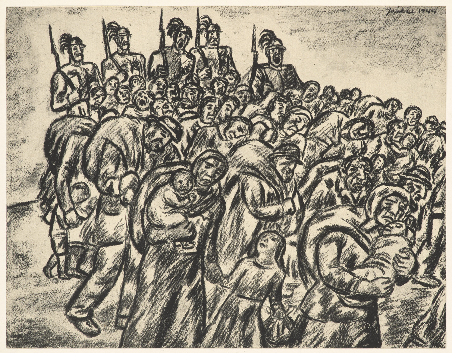 Geschichtswissenschaften – Ex Libris von Gáspar Béla auf der Innenseite des Deckels. - Mappe mit sechzehn eingeklebten Reproduktionen von Kohlezeichnungen über den Holocaust von Tibor Jankay. Herausgegeben von Bela Zsolt (1895-1949), dem ungarisch-jüdischen Autor einer der frühesten Holocaust-Erinnerungen, Nine Suitcases (Kilenc koffer). Zeichnungen von Tibor Jankay (1899-1994), der in Békéscsaba geboren wurde und bis zum Zweiten Weltkrieg in Budapest und Paris Kunst studierte, als er in ein Zwangsarbeitslager geschickt wurde. Als er später aus einem Zug nach Auschwitz entkam, wurde Jankay zum Flüchtling und tauschte seine Zeichnungen gegen Lebensmittel ein. Trotz schrecklicher Strapazen überlebte er den Krieg und wurde wie durch ein Wunder mit seiner geliebten Frau wiedervereint. Das Paar ließ sich in Venice, Kalifornien, nieder. - Ränder gebräunt, leicht bestoßen. Abbildungen in gutem Zustand.
