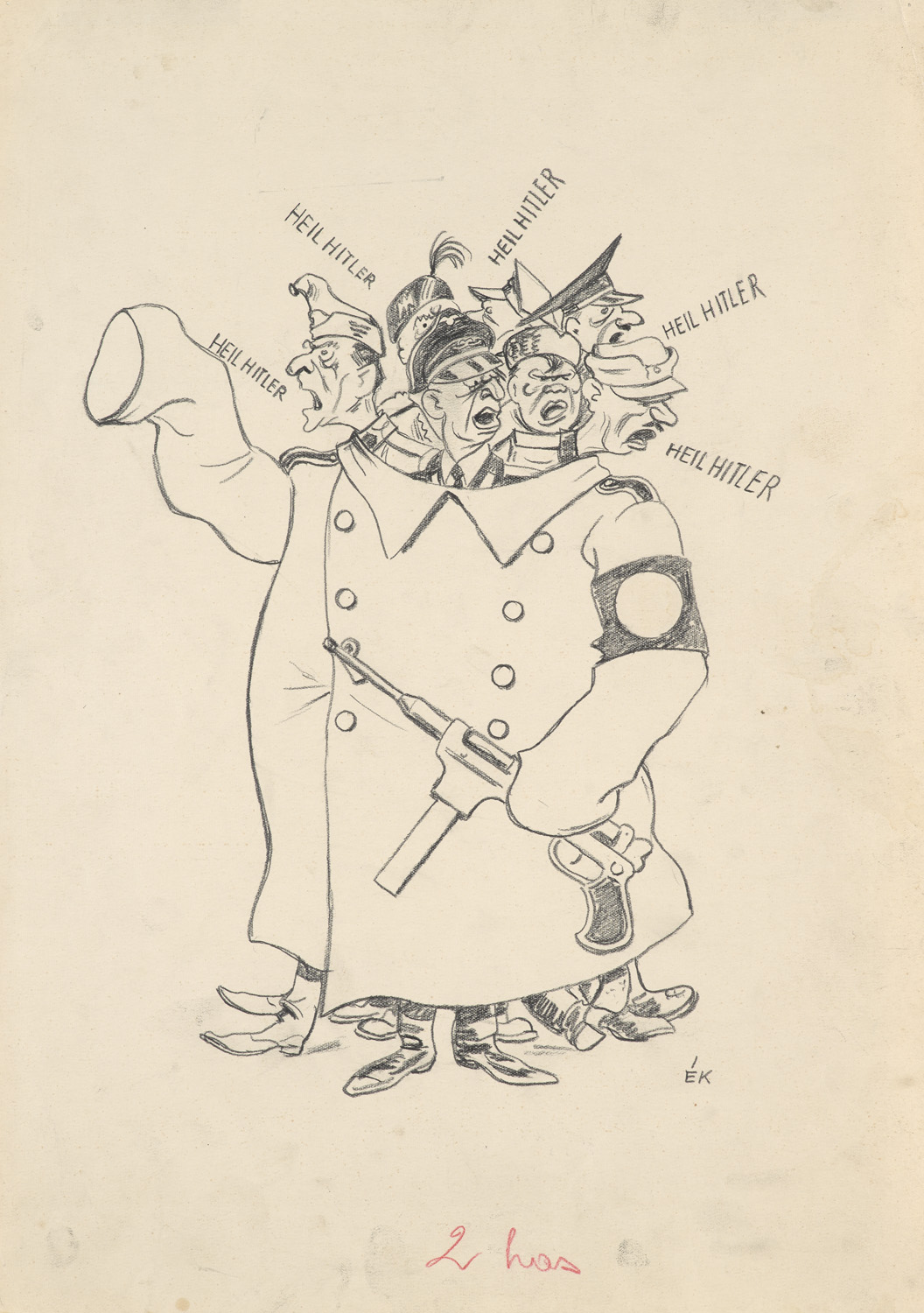 History – National Socialism - Anti-fascist caricature. - Heil Hitler. Hungary, around 1944/45. Pencil on wove paper. 29.5 x 22 cm (43 x 30.5 cm). Slightly fingerstained and with traces of studio. Verso with traces of mounting. Sándor Ék alias Alex Keil (1902-1975) was a Hungarian graphic artist who is mostly known for his communist propaganda posters and cartoons. Ék spent some months in Russia in the early 1920s where he studied under El Lissitzky. Between 1925 and 1933 he lived in Germany and worked as an illustrator for the "Arbeiter Illustrierte Zeitung" and the official newspaper of the Communist Party of Germany, "Die Rote Fahne". He gained reputation with his anti-fascist and communist posters and cartoons that could be compared to the works of John Heartfied.