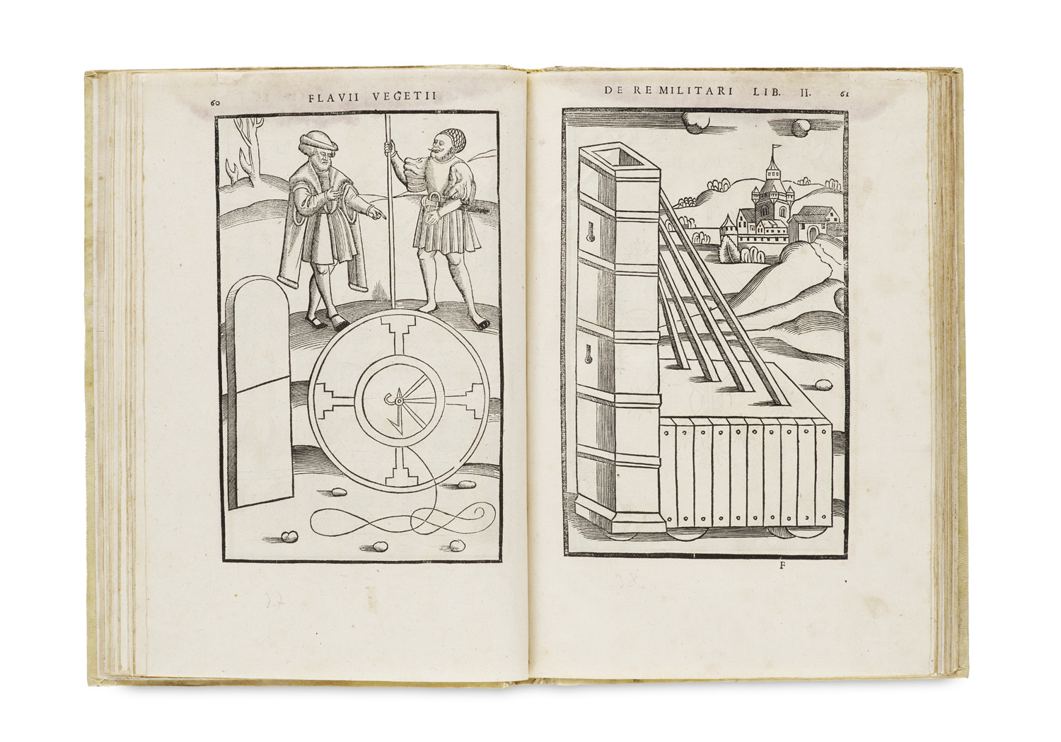 Alte Drucke, Bibeln, Klassische Autoren in den Originalsprachen – Erste in Frankreich gedruckte Ausgabe des Vegetius und der übrigen römischen Kriegsschriftsteller Frontinus und Aelianus mit den schönen Holzschnitten der Steiner- Ausgabe. - Adams V 334 - Vgl. Jähns I, 122. - Das 1. Buch handelt von Aufbringung und Ausbildung der Truppen, das 2. von Einrichtung und Dienst der Legion, das 3. von Taktik und Strategie, das 4. vom Festungskrieg. Die Holzschnitte zeigen Belagerungs- u. Kriegsmaschinen, darunter 7 Darstellungen von Taucherglocken, -anzügen und anderen Tauchutensilien. - Am Oberrand durchgehend gebräunt (ca. 2-3 cm), gelegentlich mit Hinterlegungen, vereinzelt etwas braunfleckig.