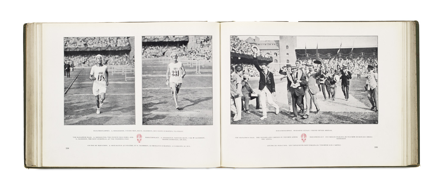 V. Olympiaden. Olympiska Spelen i Stockholm 1912 i Bild och Ord. Mit zahlreichen photographischen Abbildungen. Stockholm, Centraltryckeriet, 1912. 1 Bl., 512 S. Quer-4°. Grüne Lwd. mit goldgepr. DVignette (alte Bibliothekssignaturen, berieben und bestoßen, leicht fleckig).