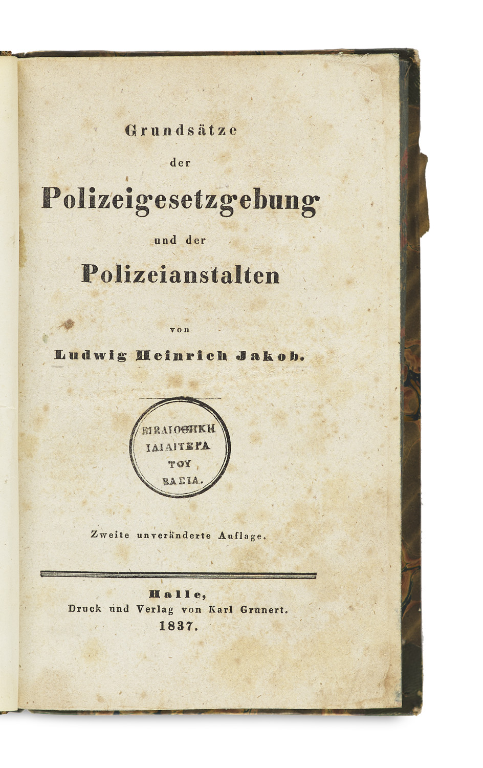 Grundsätze der Polizeigesetzgebung und der Polizeianstalten. Halle, Karl Grunert, 1837. VIII, 614 S., 1 Bl. 8°. HLdr. mit goldgepr. RTitel und RVergoldung, sowie marmoriertem Schnitt (berieben und bestoßen).