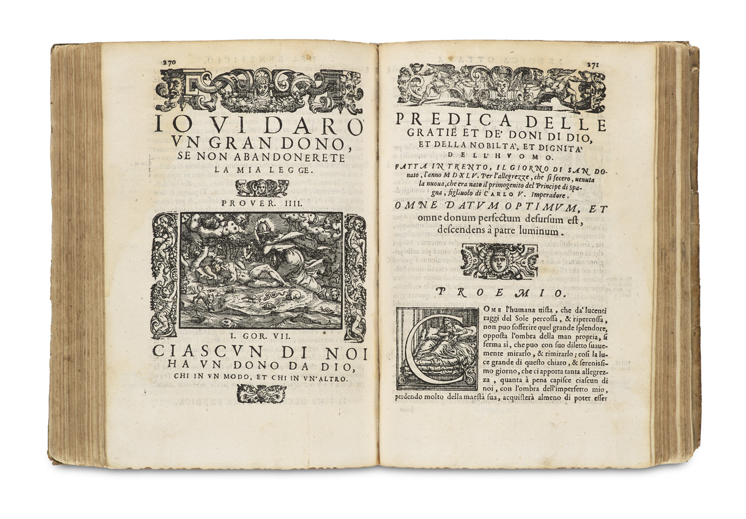 Il primo (-terzo) libro delle prediche ... Con due tavole, l'una delle prediche, l'altra delle cose più notabili. Di nuovo riordinate, et postoui le lor materie per alfabeto, con le postille nel margine. L'autorità della sacra scrittura, & con molta diligenza corrette, per beneficio degli studiosi. 3 Tle. in 3 Bdn. Mit insges. 3 Holzschnitt-Druckermarken auf Titel, 2 Holzschnitt-Druckermarken am Schluss, 29 tls. wdh. Textholzschnitten und zahlr. figürlichen Holzschnitt-Initialen. Venedig, Giolito De Ferrari, 1571. I: 14 Bll., 368 S. (recte 369), 1 Bl. II: 8 Bll., 556 S. III: 14 Bll., 406 S., 1 Bl. Angebunden: Ders. Predica del santo Purgatorio. Mit figürlicher Holzschnitt-Titelbordüre. Bologna, Rossi, 1578. 70 S., 1 Bl. Gr.-8°. Flexible Pgt.-Bde. d. Zt. (mit starken Gebrauchsspuren).