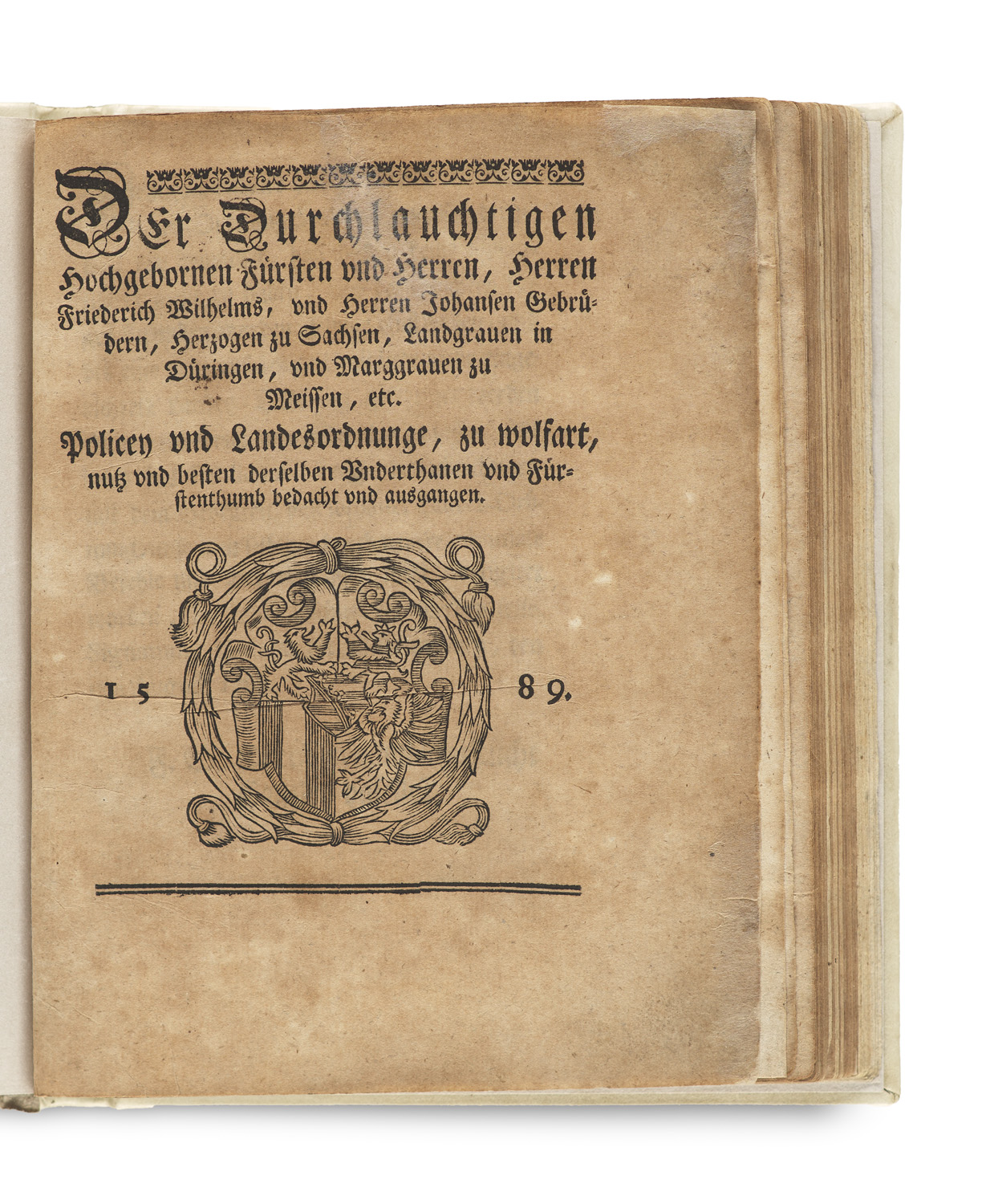 Policey und Landesordnunge(n), zu wolfart, nutz und besten derselben Underthanen und Fürstenthumb bedacht und ausgangen. Mit Holzschn.-Wappen auf Titel. Jena, Tobias Steinmann 1589. Gr.-8°. 80 Bll. (l. w.). (Mod.) Ganzpergament mit hschr. RTitel.