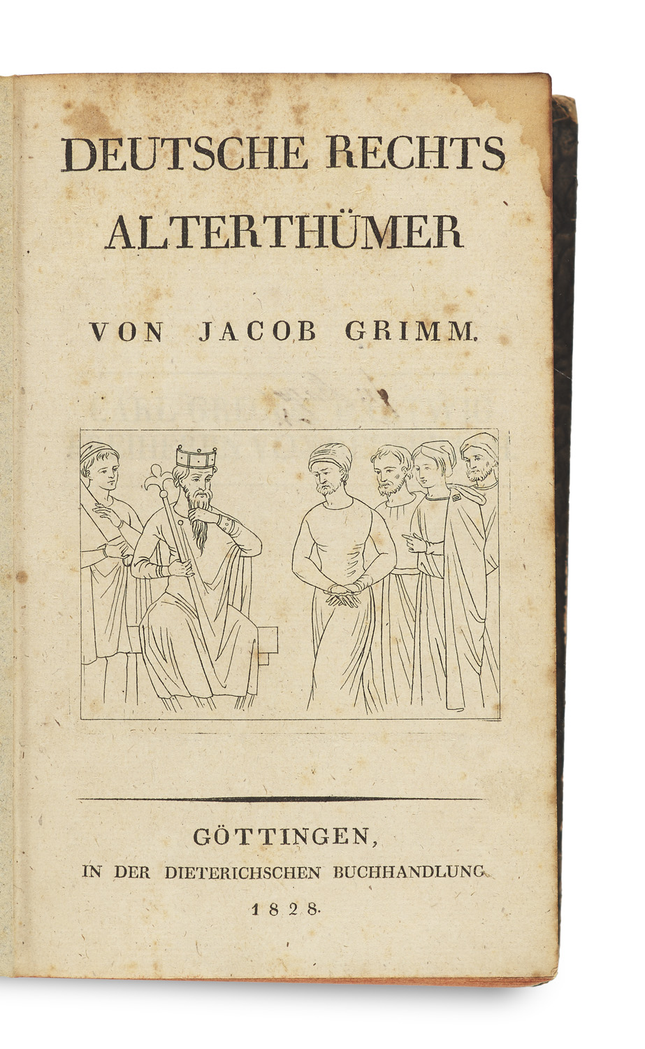 Deutsche Rechtsalterthümer. Mit gestoch. Titelvignette. Göttingen, Dieterich, 1828. XX, 970 S., 1 Bl. 8°. Pp. d. Zt. mit hs. RTitel auf grünem RSchild sowie Rotschnitt (berieben, bestoßen u. beschabt, Rücken mit senkrechtem Spannungsriss).
