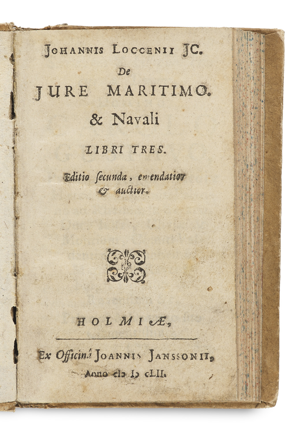 De Jure Maritimo & Navali libri tres. Editio secunda, emendatior & auctior. Stockholm, Jansson, 1652. 6 Bll., 954 S., 30 Bll (Register), 3 Bll. (Titelbl., Widmungsbll.), S. 3-214 (recte), 1 Bl. (Errata). 12°. Pbd. d. 18. Jh. mit ornament. Rgoldpräg und umseitig gesprenk. Schnitt (etwas bestoßen, berieben und mitunter gering fleckig).