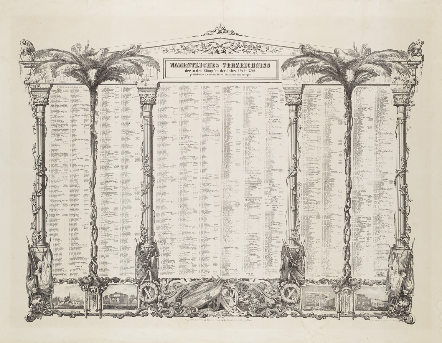 History – Name list of the Prussian soldiers who survived and were wounded in the fighting of 1848-1849. List of all those killed in action during the March Revolution in a lithographed frame with four small views of Berlin at the bottom. - Rare contemporary document with 14 columns listing the names and ranks of the killed and wounded soldiers in Berlin, Posen, Schleswig-Holstein, Mainz, Frankfurt am Main, Düsseldorf, Erfurt, Breslau, Dresden, Iserlohn, Elberfeld, Cologne, the Palatinate, and Baden. - Traces of double folding, some backed marginal tears, slightly browned (in the area of ??previous framing), slightly waterstained in the lower and lower right margins, otherwise well preserved.