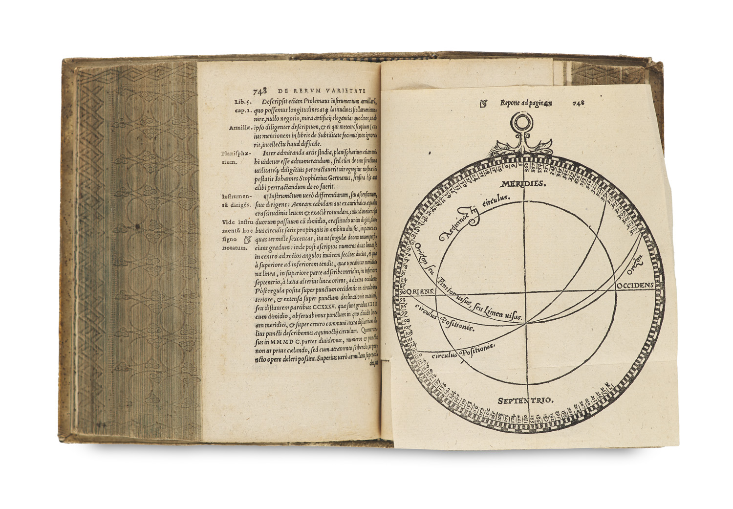 De rerum varietate libri XVII. Mit 2 Falttafeln (unzerschnittene Volvellen für Planisphäre), Porträt des Autors, Titel- und Schlussvignette (Druckermarken), zahlreichen, oft großen Textfiguren (wovon 7 blattfüllend), sowie mehreren bewohnten und/oder floral ornamentierten Initialen, alles im Holzschnitt, sowie 1 Falttabelle. Basel, Sebastian Heinrich Petri, 1581. Kl.-8°. 40 Bll. (Sign. a-e8), 1171 (1) S. 8°. Blindgeprägter Schweinslederband im Stil der Spätrenaissance datiert "1594" auf vier doppelten Bünden über leichten Holzdecken, die Decken mittels Fileten zu drei bis fünf Linien in je drei Felder mit Umrahmung gegliedert. Das Mittelfeld recto mit betiteltem Plattenstempel des Porträts von Friedrich Wilhelm I. von Sachsen-Weimar, im Feld darüber die Initialen "M I" und "W W", darunter die Datierung. Das Mittelfeld verso mit Plattenstempel des herzoglichen Wappen. Die Rahmung beider Decken mit Rollstempel von behelmten Männerköpfen im Profil, unterbrochen von Rankenwerk. Ornamental punzierter Schnitt (Mittelfeld mit Einschnitt an zwei Seiten, etwas fleckig, an den Ecken gering bestoßen und berieben).