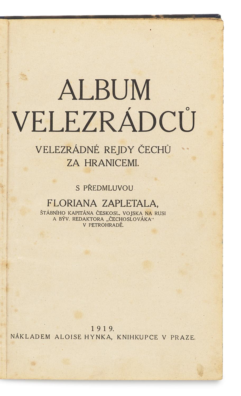 Album velezrádcu. Velezrádné rejdy Cechu za hranicemi. S predmluvou Floriana Zapletala, stábního kapitána Ceskosl. vojska na Rusi a byv. redaktora "Cechoslováka" v Petrohrade. (Ein Album von Verrätern. Die verräterischen Intrigen der Tschechen im Ausland.) Prag, Alois Hynek, 1919. Erste Auflage. XXI u. 263 S. Gr.-8°. HLwd. d. Zt. mit goldgepr. RTitel und Marmorschnitt. (Einband und Rücken leicht berieben, bestoßen).