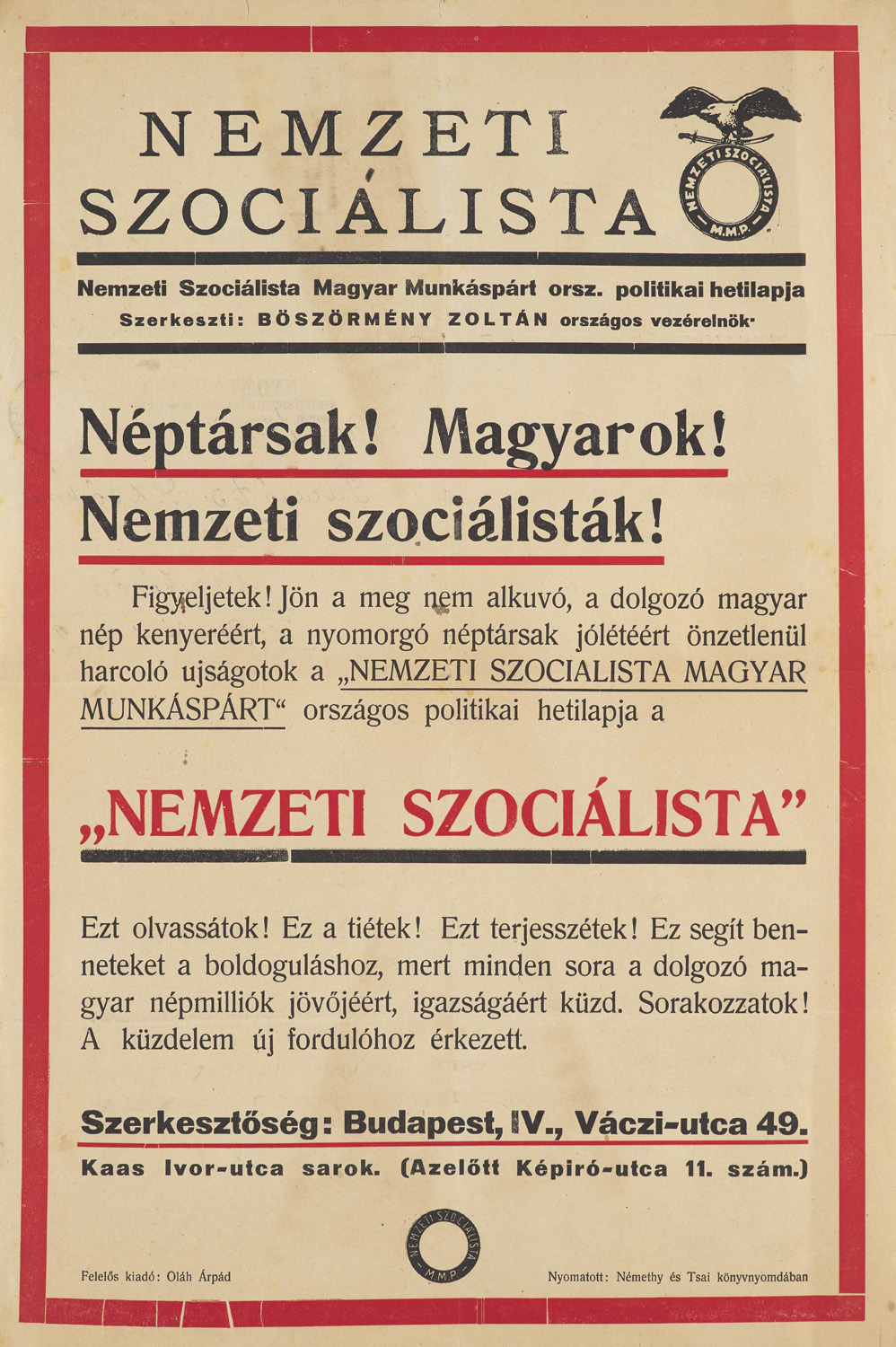 Nemzeti Szociálista. Nemzeti Szociálista Magyar Munkáspárt orsz. politikai hetilapja. Szerkeszti: Böszörményi Zoltán országos vezérelnök. Budapest, Árpád Oláh, 1932. 47 x 32 cm. Plakat gedruckt auf Papier.
