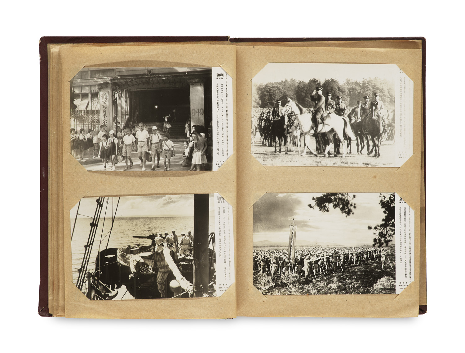 History – World War - Album with over 180 photographs. Original cardboard with gilt lettering (rubbed and bumped). - Publication of photographs from World War II in Japan and East Asia. Contains photographs of troops, vehicles, and then-Japanese Prime Minister Tojo Hideki. - Each photograph titled in the print. - Overall, in good condition.