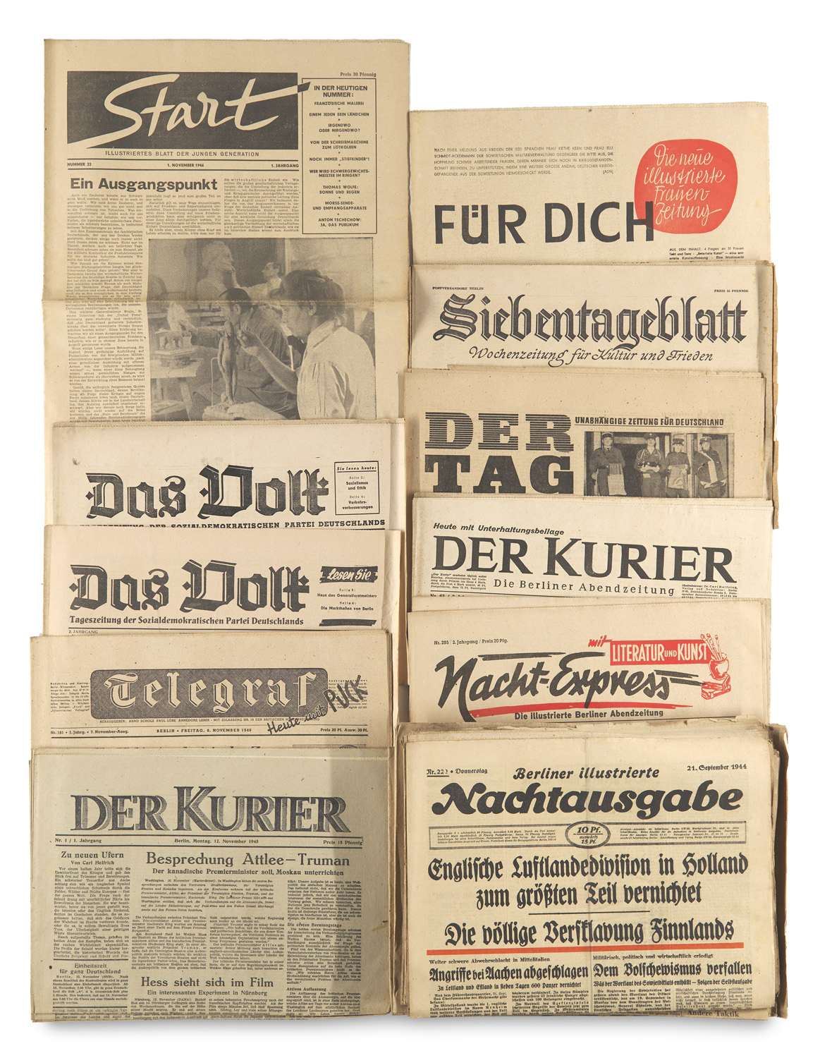 Geschichtswissenschaften – Enthält bis ca. 1920 Konvolute von Berliner Lokal-Anzeiger, Dt. Kriegszeitung, Berl. Morgenpost, Berl. Illustr. Nachtausgabe u.ä., aus der Zeit 1920-1940 Konvolute von Bild Rundschau, Lappland Kurier, Der SS-Mann, Völk. Beobachter, Berl. Ill. Zeitung, Der Stern u.ä., dazu zahlr. Merkblätter, Zeitungsausschnitte etc., 60er Jahre Zeitschriften wie Quick, Stern, Life, Revue, aktuell u.v.m.