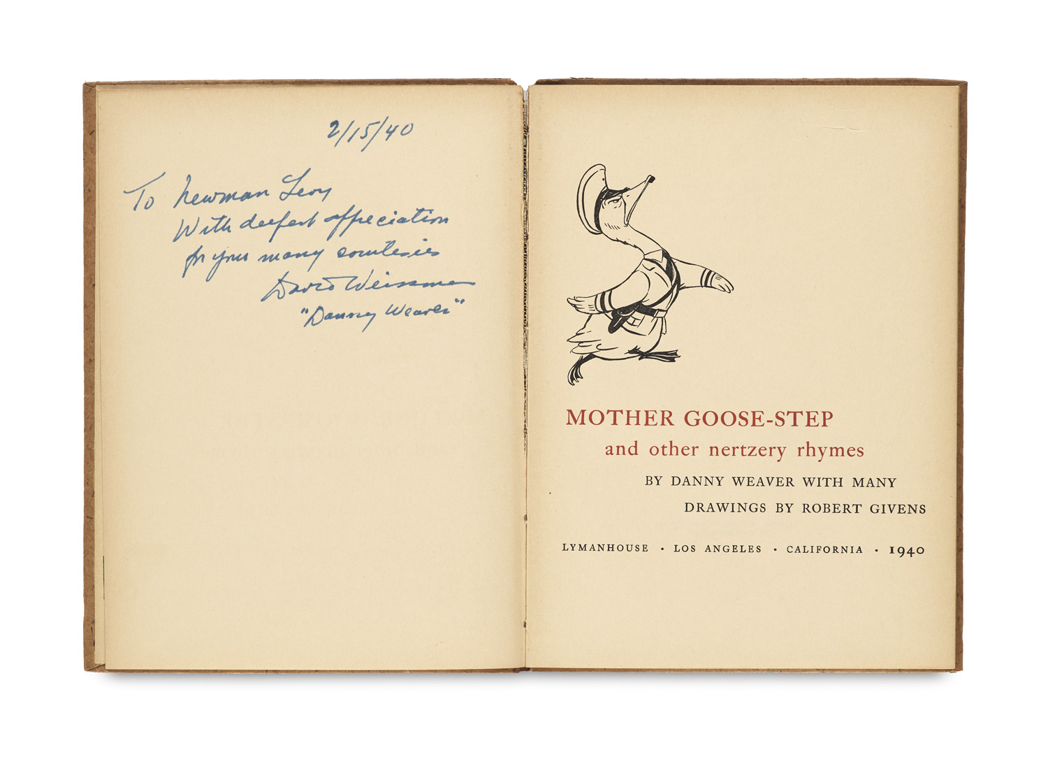Kinderbücher – Erste Ausgabe. Sehr selten. - Mit sign. Widmung von "David Weissman 'Danny Weaver'" für den Schriftsteller Newman Levy (1888-1966). - Karikiert in Versen die Politik Hitlers, versehen mit passenden Illustrationen von Robert ("Bob") Givens (1918-2017), der als Erfinder von Bugs Bunny gilt. - Mit illustr. Vorsätzen. - Buchblock angeplatzt, papierbedingt leicht gebräunt, Titel mit kl. Hinterlegung, sonst gut erhalten.