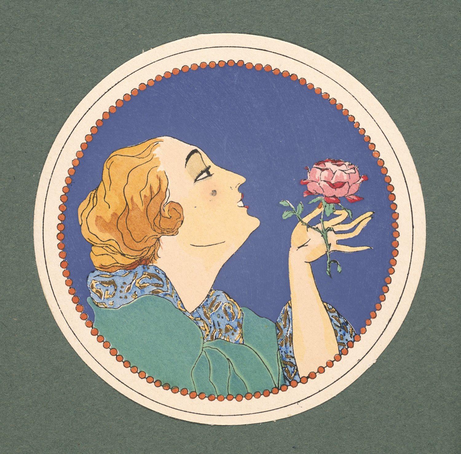 Sammlung von 34 Modellentwürfen für Schokoladen- und Parfümschachteln. 1920. Überwiegend Pochoir-Kolorit. Quer-Folio. Auf Albumseiten kaschiert, in Lwd.-Album d. Zt. (mit Defekten).
