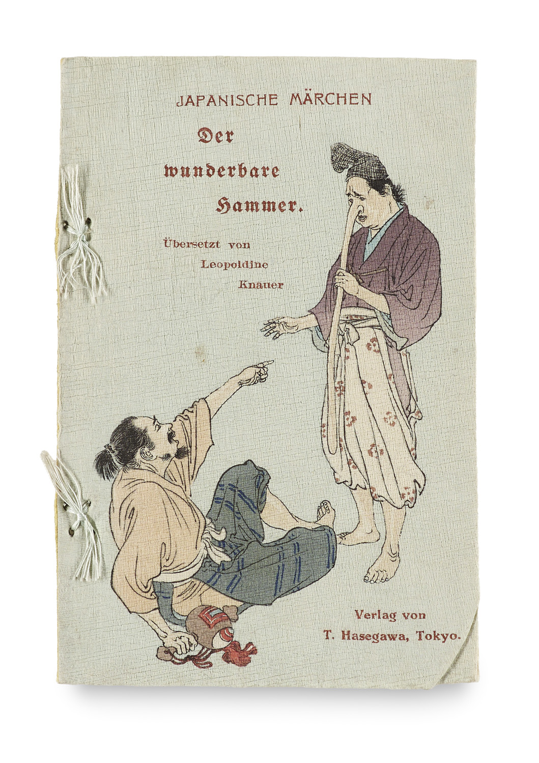 Japanische Märchen. Der wundersame Hammer. Übersetzt von Leopoldine Knauer. Tokio, T. Hasegawa, o.J. (um 1931). 12 Bl. Kl.-8°. Farb. illustr. OBrosch. auf Krepp-Papier in Block- bzw. Japanbindung mit Seidenbindung und Seidenrücken (Cover mit 2 kl. Braunflecken, untere Ecke mit kl. Quetschfalte).