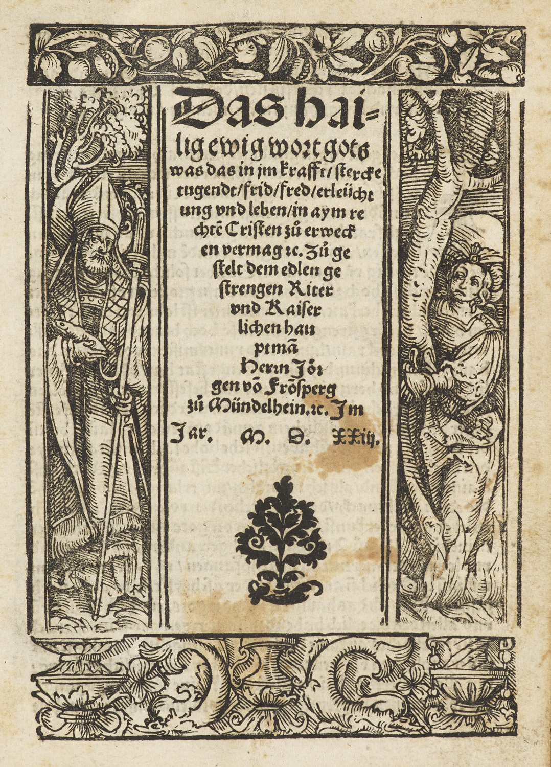 Das Hailig ewyg wort gots, was dz in jm kraft stercke, tugendt, frid, fred, erleuchtung, vnnd leben, in aym rechten Christen zu erweckn vermag. (Augsburg, Ramminger), 1523. 1 Bll. 12 unn. Bll. Ppbd. d. 19 Jhds.