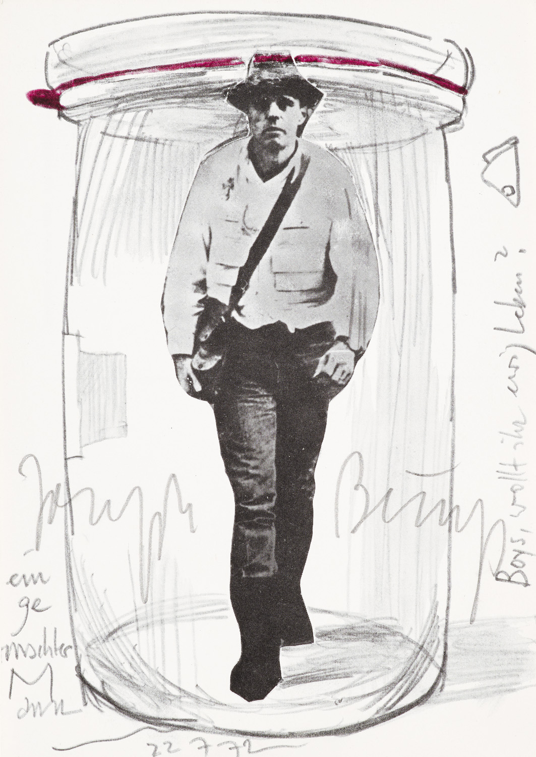 Joseph Beuys im Weck-Glas. 1972. Gedruckte Photo Montage als Offsetdruck. 15 x 10,5 cm. Von Beuys eigenhändig signiert.