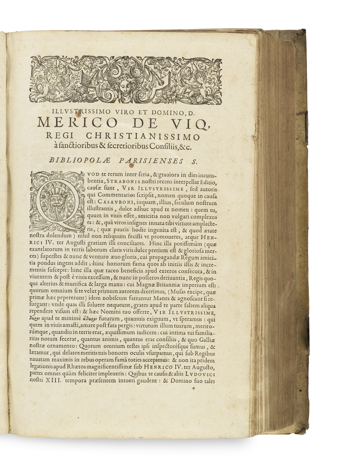 Rerum geographicarum libri XVII. I. Casaubonius recensuit. G. Xylandri recognita. Acc. F. Morelli observatiunculae. 2 Tle in 1 Bd. Mit gest. Titelvign. Paris, Typis Regiis, 1620. Folio. 6 Bll., 843, 282 S., 61 Bll. (Register). Blindgepr. Schweinsldr. d. Zt.auf 5 Bünden mit 1 (von 2) Schließen (beschabt, Rücken mit Fehlstellen).