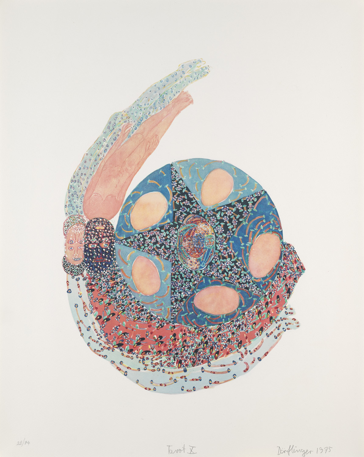 Tarot. Mit 22 signierten Farbgranolithographien. London, Fisher Fine Art, Berlin, Propylaen Verlag, Stuttgart, Galerie Valentien, 1975. Blattmaße 55 x 44 cm. Folio. Lose eingelegt in bedrucktem Original-Umschlag, in blauer Original-Leinwandmappe (diese fleckig und mit eingerissenem Bezug).