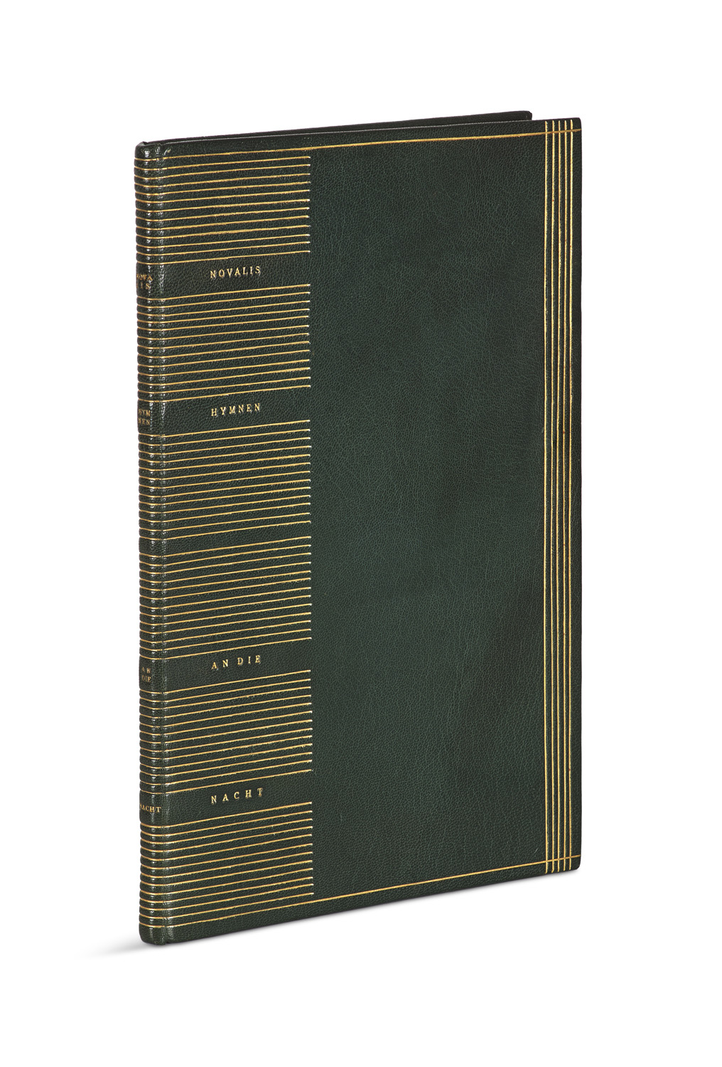 Hymnen an die Nacht. Hannover, Banas & Dette, 1923. 23 Bll. Gr.-8°. Grüner handgebundener Maroquinband mit mehrf. Filetenverg., 5-facher Innenkantenverg. und dreis. Goldschnitt.