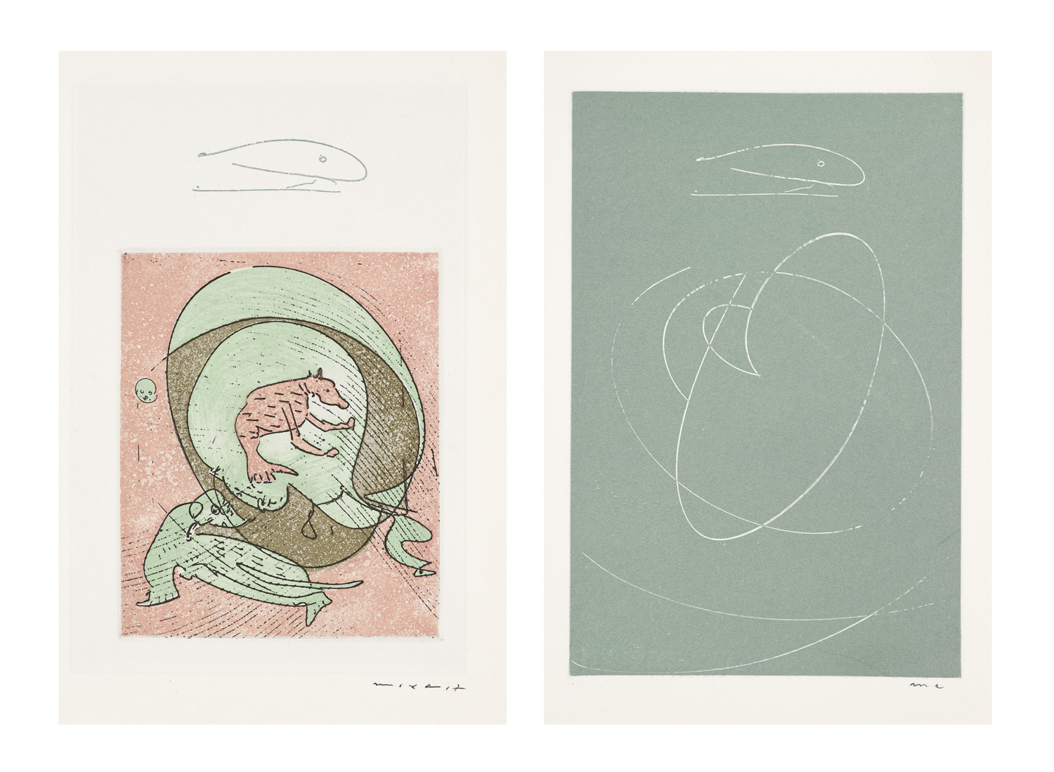 Moderne Literatur und Kunst – Eins von 99 Exemplaren der Vorzugsausgabe mit beiden Radierungen (GA 333) - Spies-Lepien 103 II D - Brusberg 111 - Auf Velin "Marais pur fil". Die beiden Radierungen druckte Georges Visat auf BFK Rives. Die einfarbige in Grün als Negativdruck von der ersten Platte wurde monogrammiert, die mehrfarbige signierte, die nur in der Vorzugsausgabe vorkommt, ist ein Zusammendruck von zwei Platten, teils mit Aquatinta. - Fehlt eine Farbtafel, sonst gutes Exemplar.