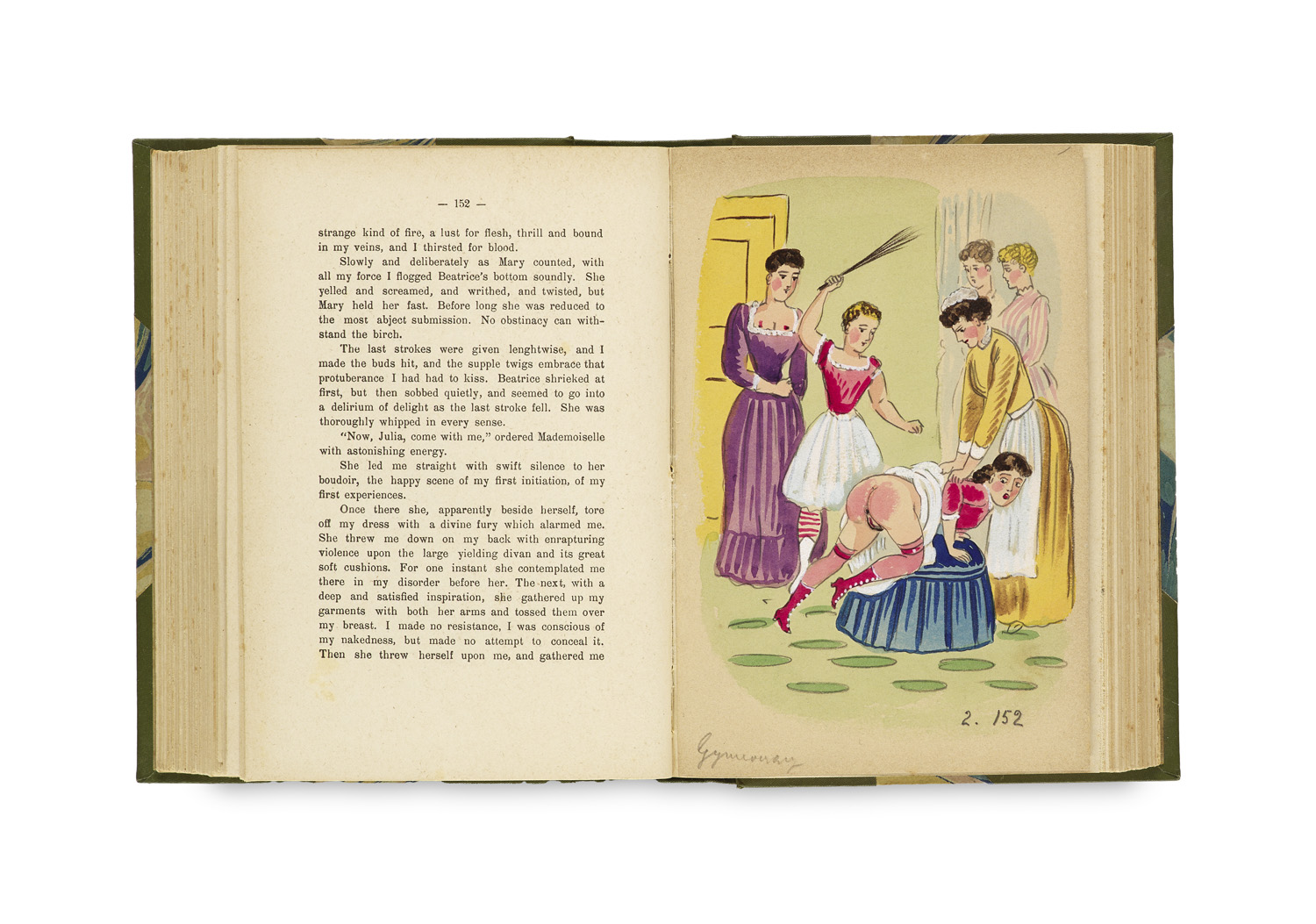 Modern Literature and Art – With 13 hand-painted, partly white-heightened watercolor plates. 3 parts in 1 vol. Half canvas with gold-stamped title (slightly rubbed). - Victorian pornographic work, which, in the form of an autobiography, deals with sadistic educational and punishment practices of the 19th century. The author describes his experience with the so-called "Petticoat Discipline" carried out by his governess after he was caught in bed with a maid. "Petticoat Discipline" or "petticoating" was a form of humiliation of disobedient boys, in which they were forced to wear girls' clothing, and can still be found today as a fetish or subgenre of erotic literature. Magnus Hirschfeld praised the work "Gynecocracy" for its psychological insights. - Some minimal foxing. Overall, very well preserved.