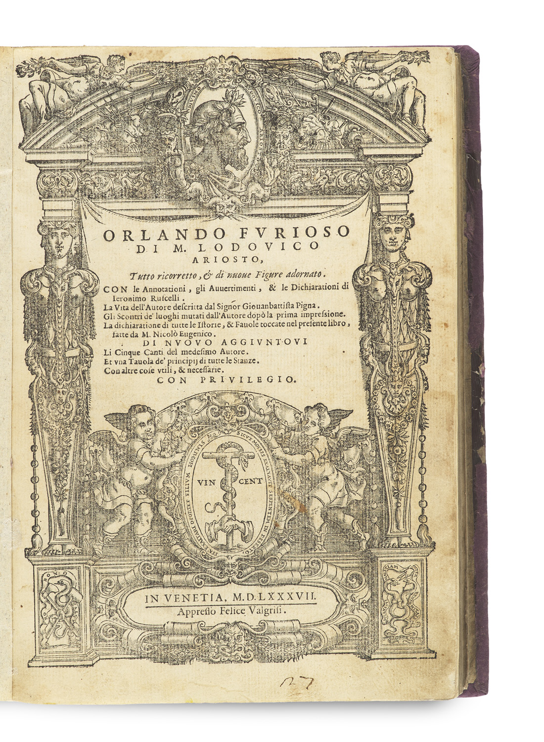 Orlando furioso ... Tutto ricoretto, & di nuove Figure adornato. Con le Annotationi, gli Avvertimenti, & le Dichiarationi di Ieronimo Ruscelli ... 2 Teile i. e. Band. Mit Holzschnitt-Titeleinfassung, Holzschnitt-Druckermarke (diese wiederholt) und 51 ganzseitigen Kapitelholzschnitten, diese je mit vierseitiger Bordüre, sowie ebensovielen illustrierten Rahmen und belebten Initialen. Vendig, Valerio Bonelli für Felice Valgrisi, 1587. 8 Bll. (Titelbl., Widmbll., Namensverz.), 654 S., 16 Bll. (Verz. d. Gedichtanfänge), 1 Bl. (leer). Gr.-8°. Weinroter Pbd. des frühen 19. Jh. mit ornamentalem RGoldtit. und späteren Vorsätzen (frühere Fehlstellen an Rücken, Ecken und Kanten restauriert).