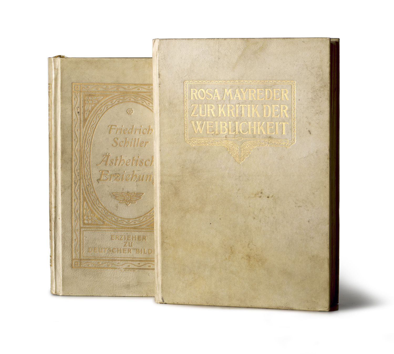 Moderne Literatur und Kunst – Enthält: Rosa Mayreder. Zur Kritik der Weiblichkeit. Essays. Jena u. Leipzig, 1905. OPgt. mit Deckel- u. Rückentitel und Kopfgoldschnitt (leicht fleckig). - Eins von 20 nummer. Exemplaren auf Bütten in Ganzpergament. - Friedrich Schiller. Ästhetische Erziehung. (Erzieher zu Deutscher Bildung, Bd. 4). Ebd. 1905. - Eins von 100 nummer. Exemplaren auf Bütten in Ganzpergament (span. Bindung) (etw. fleckig, Vorsatz gelockert).