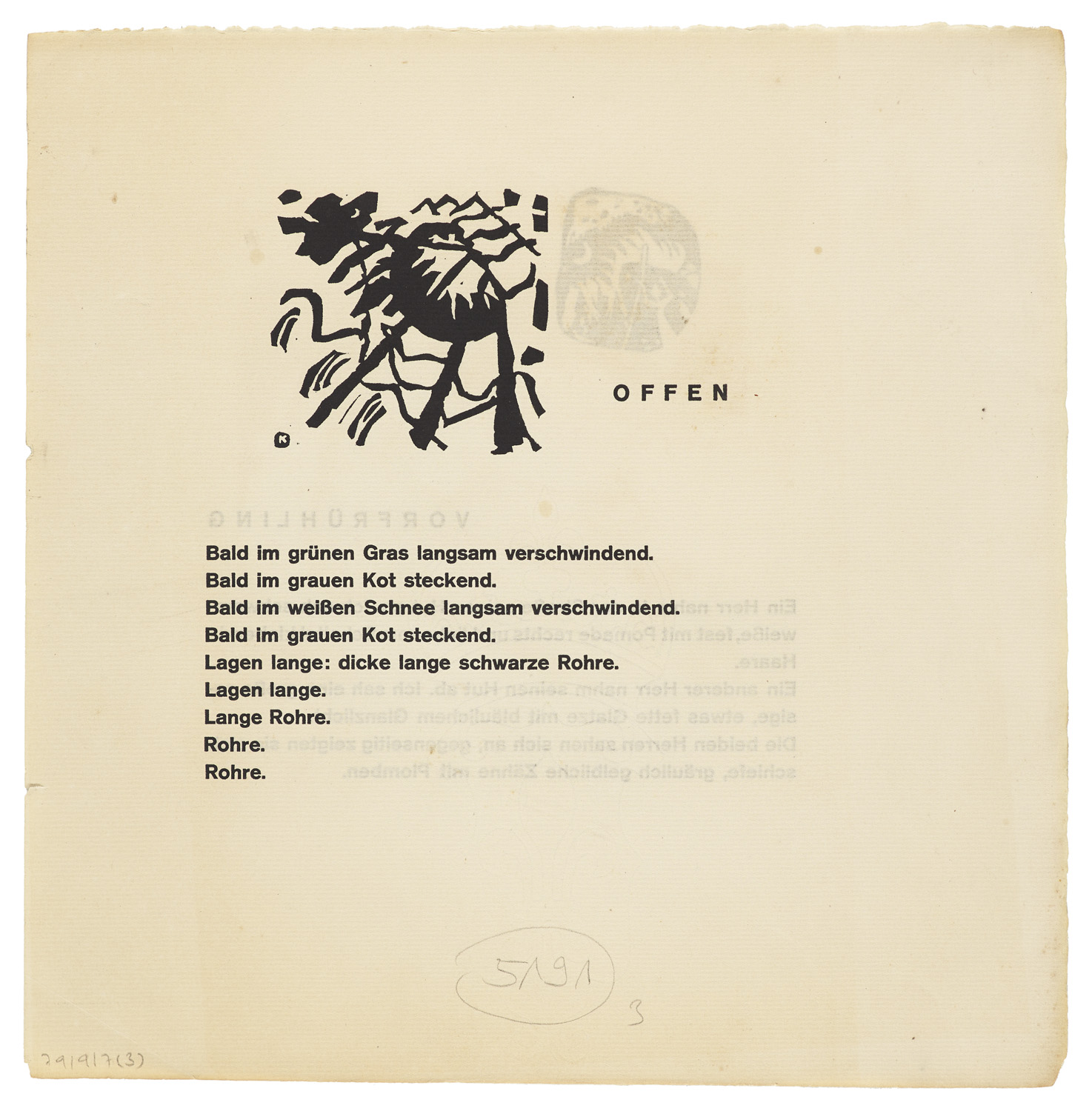 Modern Literature and Art – 3 graphik works from: Klänge. With 5 woodcuts, partly double-sided and on laid paper. With the accompanying typographical text, also on the verso. - Some bumping and creasing in the margins, slight losses in places. Paper slightly browned due and occasional faint foxing. Overall good. Superb, clear and deep-black impressions with margin. - With works as mentioned above.