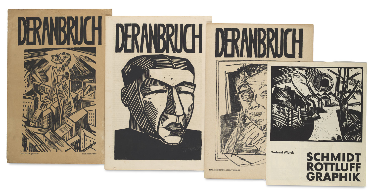 Der Anbruch. Sammlung von 3 Ausgaben. Mit tls. ganzs. Ill. nach OGraphiken von Karl, Schmidt-Rottluff, Max Beckmann u. Franz M. Jansen. Berlin, J.B. Neumann, 1919-1922. Heftmaße je 41 x 28 cm.