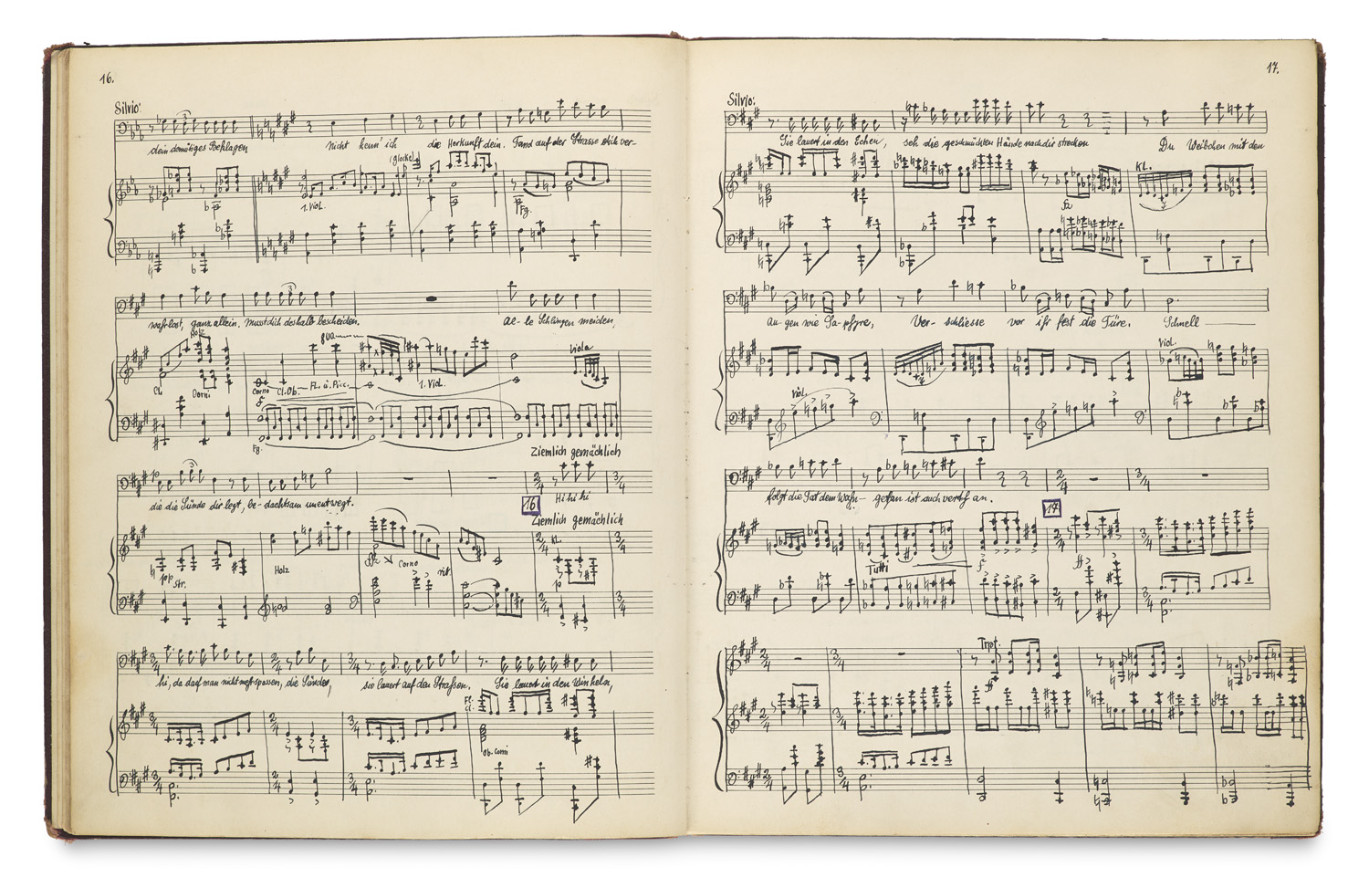 Modern Literature and Art – 2 vols manuscripts of music in pencil and ink. Contemp. half cloth with mounted ms. title (somewhat rubbed and bumped). - Original copy of an unpublished opera, which can be considered a musical adaptation of the one-act play 'Die vier Toten der Fiametta' by his father, the writer and librettist Alexander Siegmund Pordes-Milo (1878-1931). Based on this one-act play, Herwarth Walden's pantomime 'Die vier Toten der Fiametta' premiered on 15 June 1911 at the Kleines Theater Unter den Linden under the direction of director William Wauer. From today's perspective, it is considered one of the first highlights of the theatre work of the artists' group "Der Sturm" and was highly praised by Döblin and others. As a scandal, however, it was also met with biting criticism from the Berlin press and others, especially the music composed by Herwarth Walden. A little later, on 6 July 1911, when Alexander Siegmund Pordes-Milo published his one-act play 'Die vier Toten der Fiametta' in the 'Schaubühne', intended for the spoken theatre, a controversy also flared up with Walden over the authorship. - In add.: Theatre programmes and posters, photos etc. - Partly minor defects, overall well preserved condition.