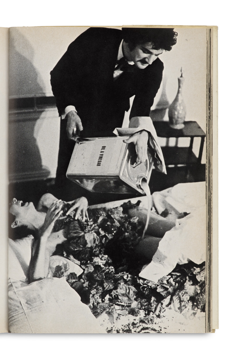 Modern Literature and Art – First edition. - The book illustrates the short story by Mason Williams "How to derive the maximum enjoyment from crackers" (1967), the text is printed on the inside back cover. The figures in the photos are Larry Bell (man), Léon Bing (woman), Rudi Gerneich (page) and Tommy Smothers (chauffeur). Crackers, which was intentionally photographed like a collection of movie scenes, was the basis for Ruscha's 1970 film Premium - Slightly browned.