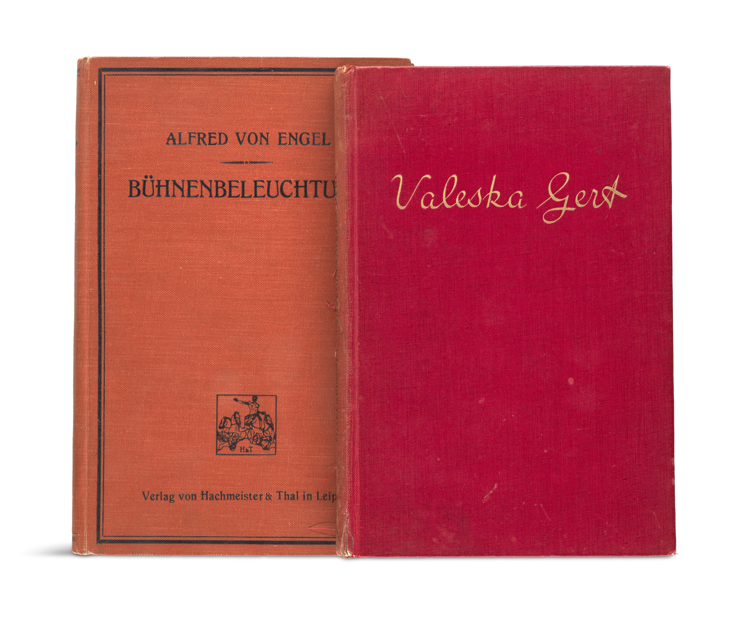 Moderne Literatur und Kunst – Auf dem vorderen fliegenden Vorsatz mit der Widmung: "Einen herlichen Gruss von Deiner Valeska G. Berlin, 17. III. 28." - Vorderer Vorsatz mit hs. Besitzeintrag. 1 Bl. mit Anstreichungen. - Dabei: Alfred von Engel. Bühnenbeleuchtung. Mit zahlr. Textabb. Leipzig, Hachmeister & Thal, 1926. 4 Bll., 174 S. 8°. Bedruckte OLwd. (etwas fleckig).