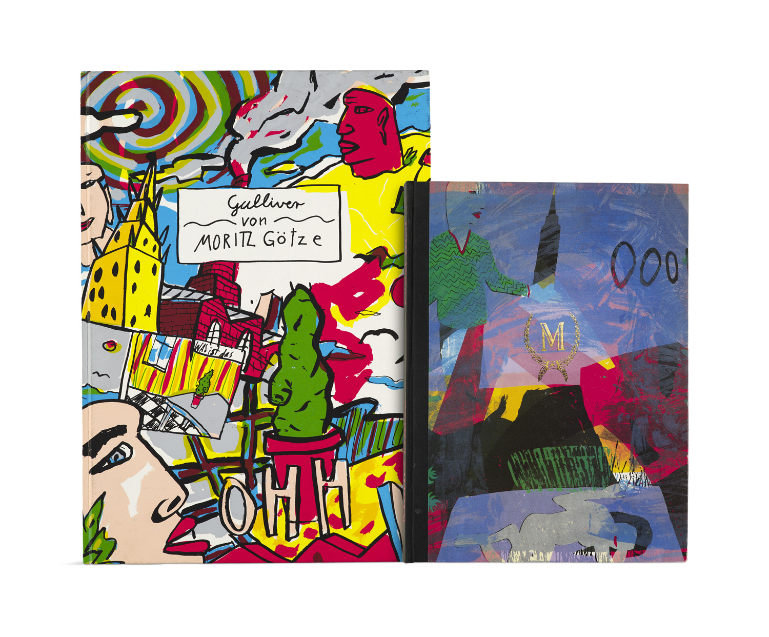Moderne Literatur und Kunst – 14. Druck der Burgart Presse. - Eins von 50 numm. Exemplaren der Ausgabe A (aber ohne die Flachfiguren), vom Künstler im Druckvermerk signiert. - Dabei: M. Götze, C'est moi. Mit zahlr. Abb. u. 7 eingebundenen Orig.-Serigraphien. Halle, Hasenverl. 1995. 4°. OHLwd. Ausstellungskatalog. - Beiliegend: 3 farb. sign. Siebdrucke (verschied. Einladungskarten).