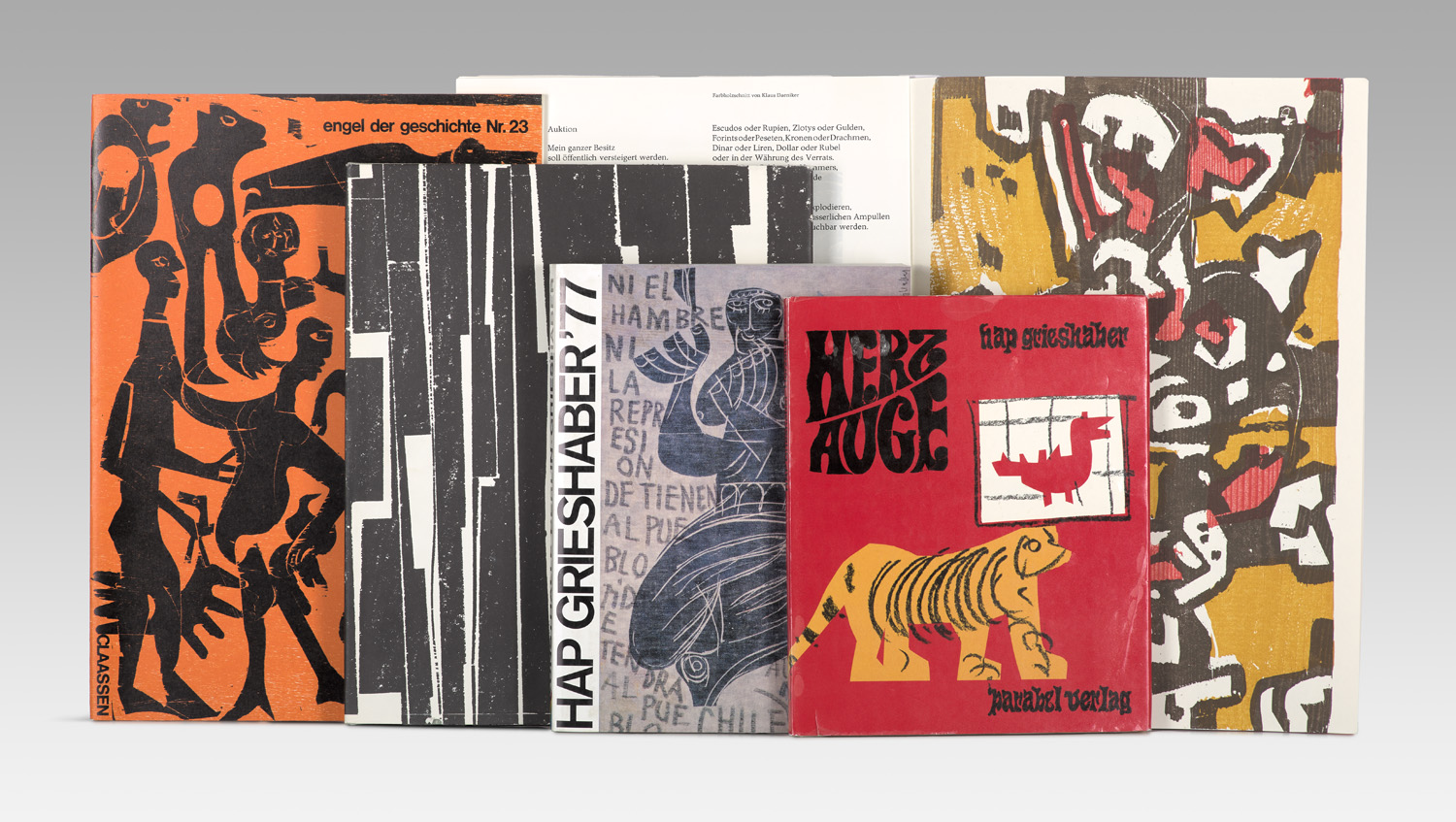 Moderne Literatur und Kunst – Enthält: I. Kreuzweg. 1967. Fol. OLwd. in ill. OUmschlag in OPp. Schuber. - II. Herzauge. 1969. 4°. OLwd. in ill. OUmschlag. III. Spektrum Nr. 51. 1972. Fol. Ill. OBroschur. Vom Künstler signiert. - IV. Spektrum September 1972. 14. Jahrgang. 1972. Fol. Ill. OBroschur. Vom Künstler signiert. - V. Engel der Geschichte Nr. 23. 1976. Fol. Il. OBroschur. 3 Holzschnitte signiert. - VI. HAP Grieshaber '77. 1977. 4°. Ill. OBroschur. - Insgesamt wohlerhalten. Die OHolzschnitte durchweg prachtvoll und kräftig im Druck, die Maserung teils fein mitzeichnend, die Farben satt und leuchtend.
