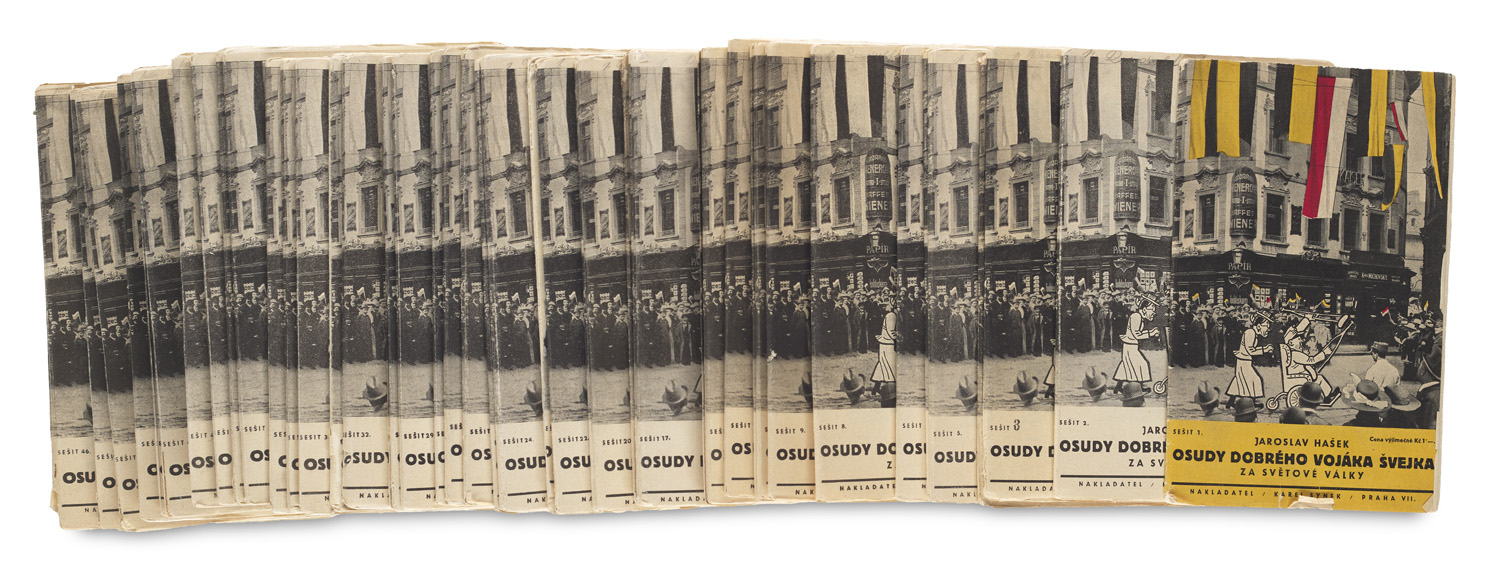 Modern Literature and Art – Complete set. - Soft cover, untrimmed. (Binding of issue 23 loose. Edge tears. Some issues slightly creased at edges). - Jaroslav Hasek's "The Good Soldier Svejk", published in a series of forty-six pamphlets with John Heartfield's montage on the cover. Heartfield (1891-1968) created his montage with the use of the iconic drawing of Svejk by the book's illustrator, Josef Lada (1887-1957). - Slightly creased at edges. In relatively good condition.
