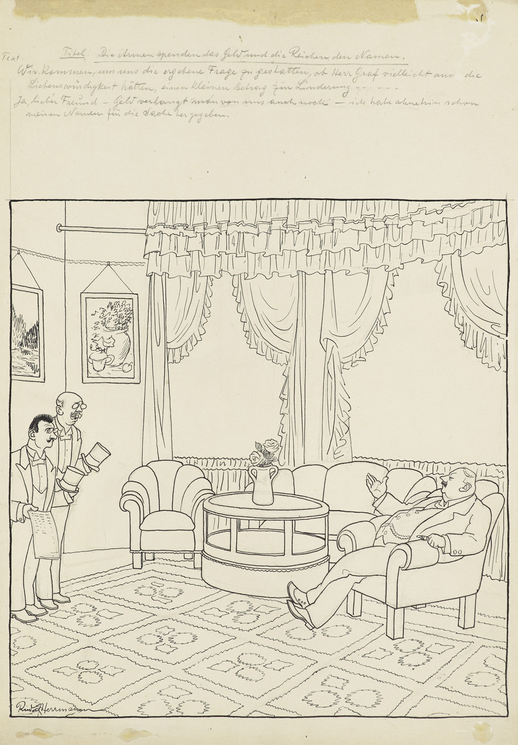 Modern Literature and Art – Pen and ink drawing on vellum. Signed. - With handwritten text above the drawing: "We come to ask whether Mr. Graf might be so kind as to contribute a small amount to alleviate the situation... Yes, dear friend - they're asking us for money too - I've already lent my name to the cause anyway." - With remnants of a previous mounting. Minimal marginal wear. Overall, in good condition.